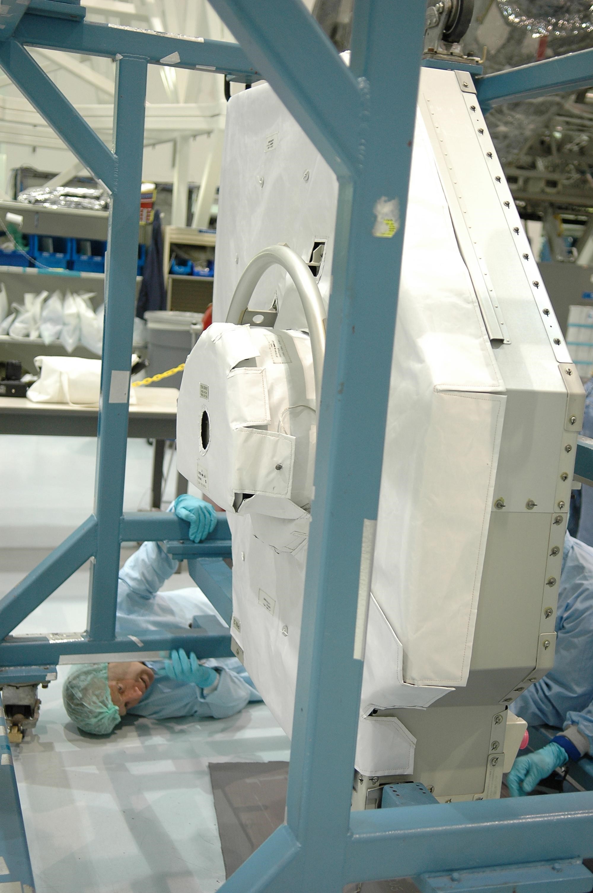 KENNEDY SPACE CENTER, FLA. - In the Space Station Processing Facility at NASA Kennedy Space Center, STS-121 Mission Specialist Michael Fossum looks underneath the replacement trailing umbilical system reel assembly that will be installed on the International Space Station. He and other crew members -- Commander Steven Lindsey, Pilot Mark Kelly and Mission Specialists Lisa Nowak, Stephanie Wilson and Piers Sellers -- are at Kennedy to take part in the crew equipment interface test (CEIT).