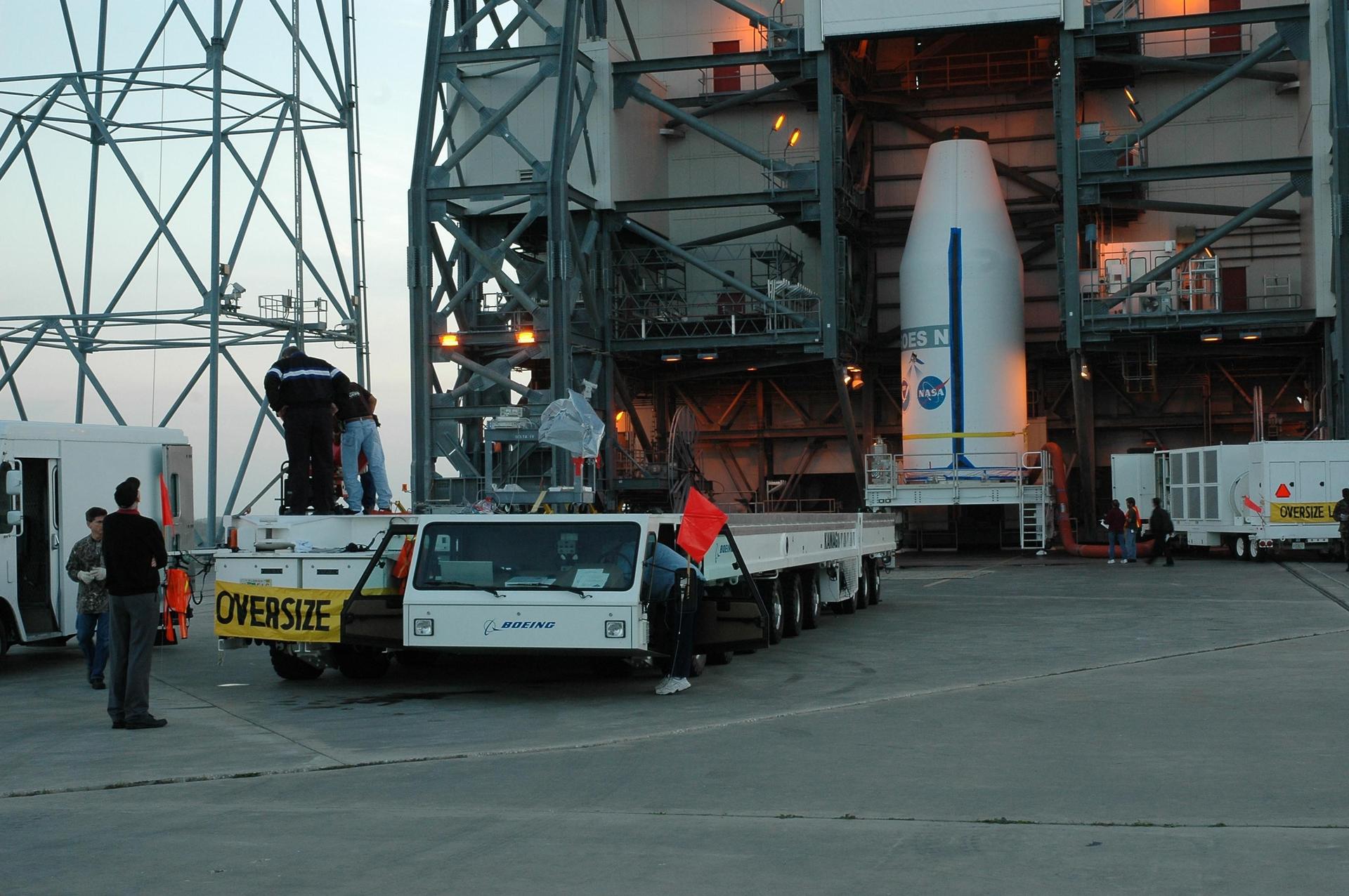 KENNEDY SPACE CENTER, FLA. - On Launch Complex 37 at Cape Canaveral Air Force Station in Florida, technicians prepare a transporter to move the GOES-N satellite, just demated from its Boeing Delta IV rocket. Launch of the satellite was postponed in August 2005 due to technical issues and postponed to a later date. Due to the extended length of time the spacecraft has been atop the rocket without launching, the weather satellite is being returned to the Astrotech Space Operations payload processing facility for some precautionary retesting and state-of-health checks. GOES-N is the latest in a series of Geostationary Operational Environmental Satellites for NOAA and NASA providing continuous monitoring necessary for intensive data analysis. Photo credit: NASA/Jack Pfaller