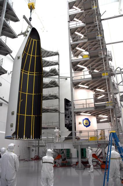 KENNEDY SPACE CENTER, FLA. - At Astrotech Space Operations payload processing facility in Titusville, Fla., the first half of the fairing (left) is removed from around the GOES-N spacecraft. Workers are using the stand to detach the fairing from around the spacecraft. Workers will use the stand to begin detaching the fairing from around the spacecraft. The fairing protects the spacecraft during launch and flight through the atmosphere. Once out of the atmosphere, the fairing is jettisoned. Removing the fairing will allow workers access to the spacecraft. GOES-N was demated from its Boeing Delta IV launch vehicle when the launch was postponed in August 2005 due to technical issues. Due to the extended length of time the spacecraft had been atop the Delta IV rocket without launching, the weather satellite was returned to Astrotech for some precautionary retesting and state of health checks. GOES-N is the latest in a series of Geostationary Operational Environmental Satellites for NOAA and NASA providing continuous monitoring necessary for intensive data analysis. Photo credit: NASA/Jim Grossmann