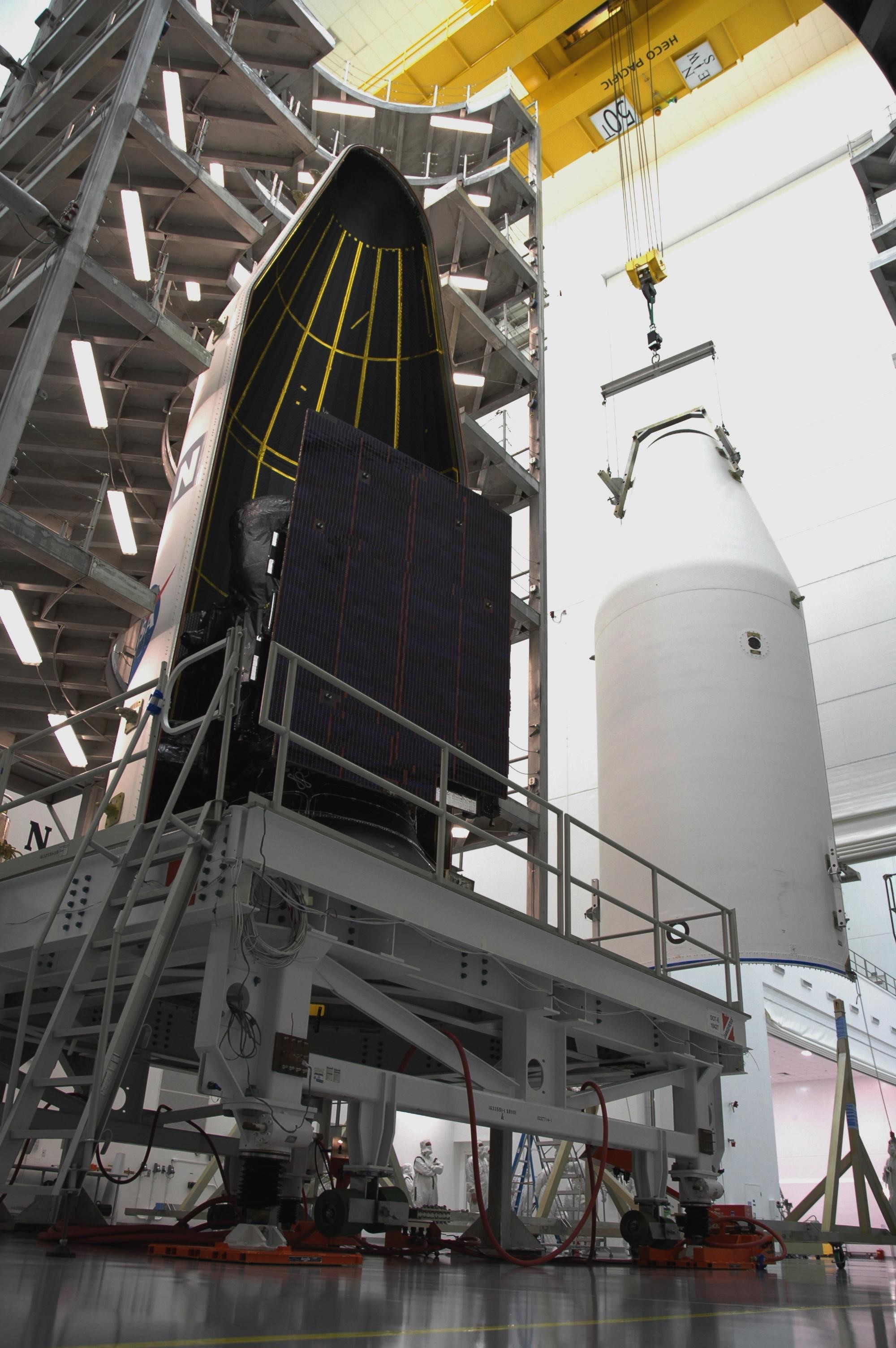 KENNEDY SPACE CENTER, FLA. - At Astrotech Space Operations payload processing facility in Titusville, Fla., the GOES-N spacecraft sits on the workstand after removal of the first half of the fairing, suspended at right. The second half remains behind it. Workers are using the stand to detach the fairing from around the spacecraft. Workers will use the stand to begin detaching the fairing from around the spacecraft. The fairing protects the spacecraft during launch and flight through the atmosphere. Once out of the atmosphere, the fairing is jettisoned. Removing the fairing will allow workers access to the spacecraft. GOES-N was demated from its Boeing Delta IV launch vehicle when the launch was postponed in August 2005 due to technical issues. Due to the extended length of time the spacecraft had been atop the Delta IV rocket without launching, the weather satellite was returned to Astrotech for some precautionary retesting and state of health checks. GOES-N is the latest in a series of Geostationary Operational Environmental Satellites for NOAA and NASA providing continuous monitoring necessary for intensive data analysis. Photo credit: NASA/Jim Grossmann