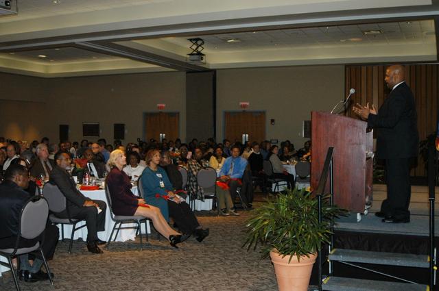 KENNEDY SPACE CENTER, FLA. - At the dais (right), Kwatsi Alibaruho speaks to guests at NASA Kennedy Space Center's annual BEST (Black Employee Strategy Team) African-American History Month luncheon. Among attendees was Center Director Jim Kennedy. The guest speaker for the luncheon, Alibaruho is a flight director from Johnson Space Center Mission Control. The theme for this year's luncheon was "Creating New Paths From Journeys Past." The luncheon was held in the Kurt H. Debus Center at Kennedy Space Center's Visitor Complex. Photo credit: NASA/George Shelton