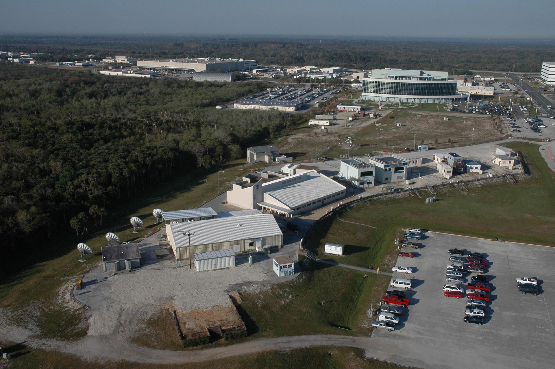 KENNEDY SPACE CENTER, FLA. - This aerial view shows the Press Site (in the foreground) comprising the NASA TV studio, the NASA News Center behind it, buildings used by local NBC and CBS television stations, and newly erected prefabricated buildings for local newspapers and correspondents for CNN, AP and others. A year-long project removed and replaced hurricane-hazardous trailers and bleachers from the site. In the background, at right, is the newly build Operations Support Building II. Photo credit: Cory Huston