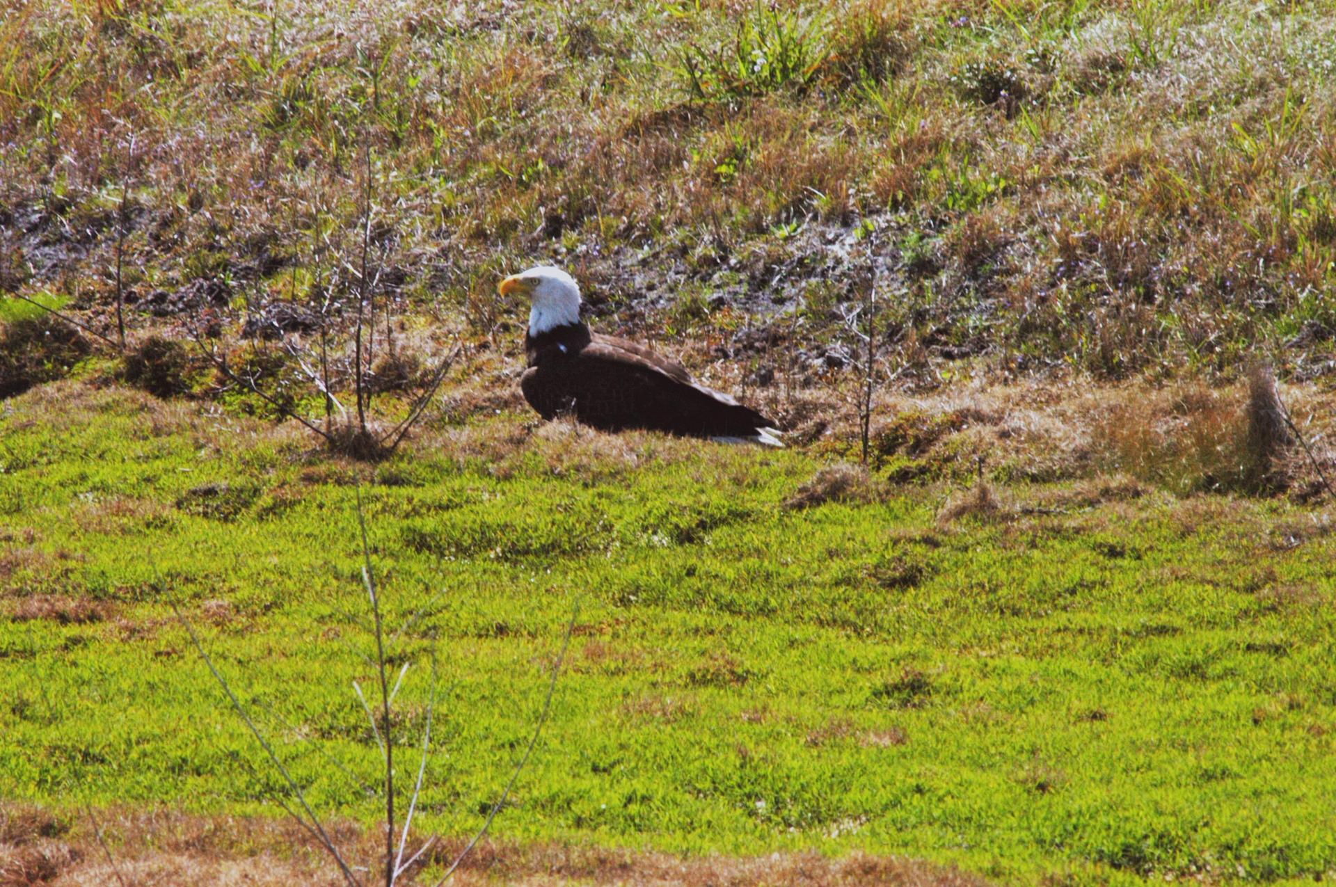 KENNEDY SPACE CENTER, FLA. - A bald eagle on the ground may be protecting its food or resting after a hunt for food. This one was spotted near S.R. 3 on Kennedy Space Center, close to its nest. The nest is one of a dozen active nests throughout the Merritt Island National Wildlife Refuge, which shares a boundary with the Center. Eagles' habitats are near lakes, rivers, marshes and seacoasts. Nests are masses of sticks, usually in the top of a tall tree. Even though they are fish eaters, bald eagles will take whatever prey is available and easiest to obtain. Bald eagles which live along the coast and on major lakes and rivers feed mainly on fish. Bald eagles fish in both fresh and salt water. Because of the energy expended during hunting, an eagle has to spend a lot of time resting quietly. It's estimated that only one out of eighteen attacks are successful. Photo credit: NASA/Jim Grossmann