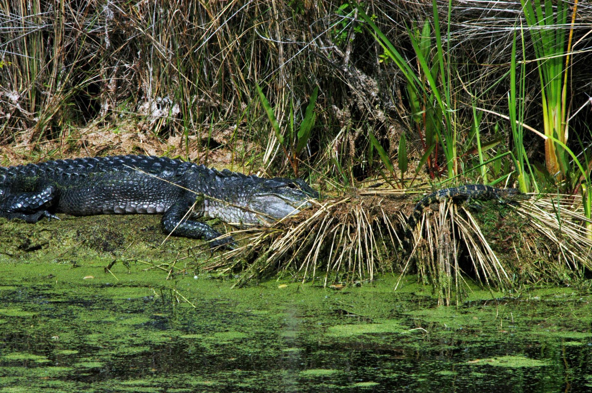 KENNEDY SPACE CENTER, FLA. - In a canal on Kennedy Space Center, an alligator stays close to its young, at right. Nearly 5,000 alligators can be found in canals, ponds and waterways throughout the Center and the surrounding Merritt Island National Wildlife Refuge. American alligators feed and rest in the water, and lay their eggs in dens they dig into the banks. The young alligators spend their first several weeks in these dens. The Wildlife Refuge encompasses 92,000 acres that are a habitat for more than 331 species of birds, 31 mammals, 117 fishes, and 65 amphibians and reptiles. Photo credit: NASA/Jim Grossmann