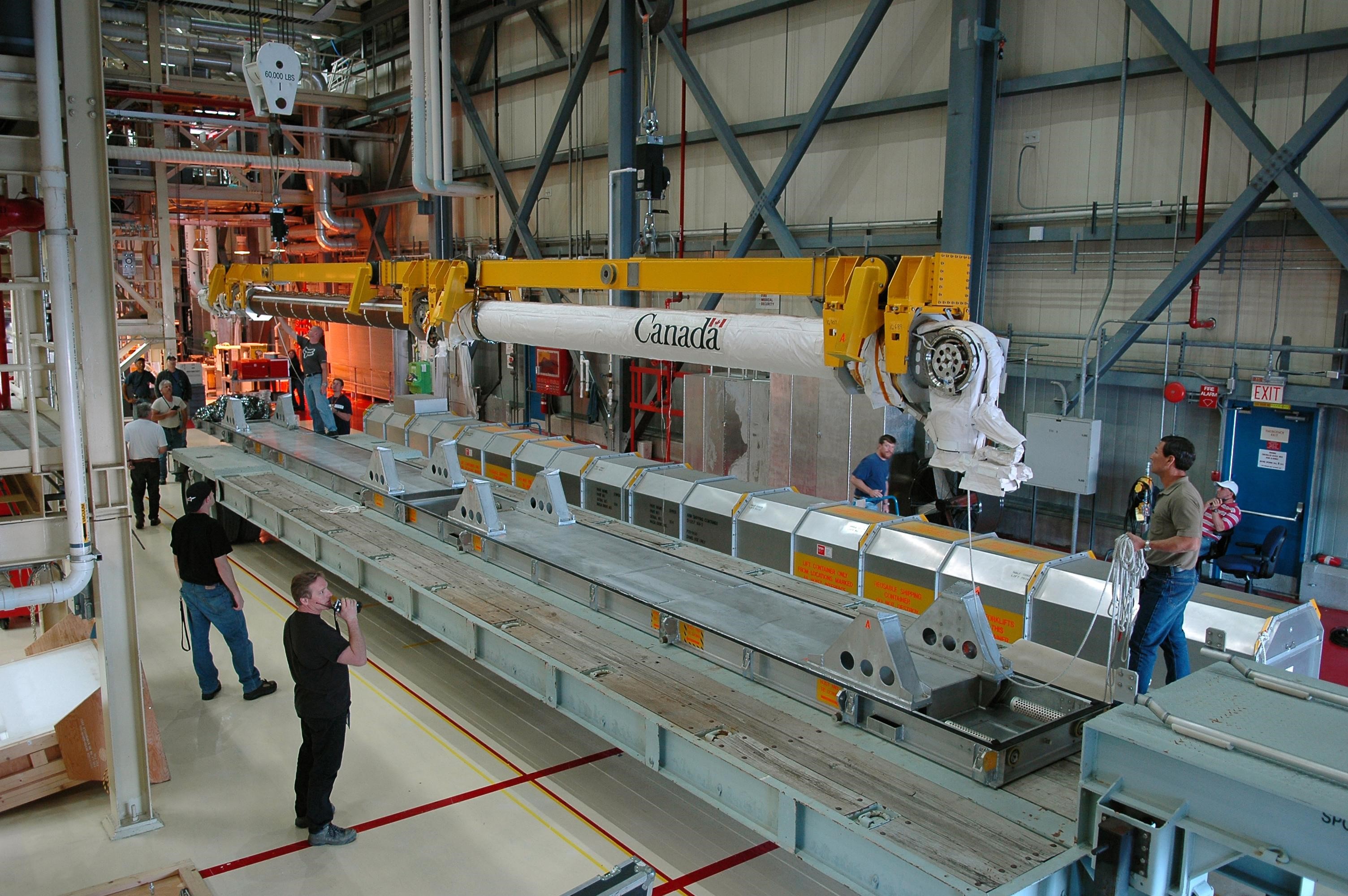 KENNEDY SPACE CENTER, FLA. - Inside the Orbiter Processing Facility bay 3 at NASA's Kennedy Space Center, workers lower Discovery's robotic arm onto a flat bed in a work area. The arm was removed from Discovery's payload bay. The arm was removed due to damage found on the arm after it was accidentally bumped by a bridge bucket in the payload bay. Ultrasound inspections revealed a small crack, measuring 1.25 inches by 0.015 inch deep. The arm will be sent back to the vendor for repair. The bucket was being used by technicians cleaning the area and was in the process of being stowed. A bridge bucket is a personnel transport device that is suspended from an overhead bridge that moves back and forth above the shuttle's mid-body. It allows workers to access the payload bay area without walking or standing on the payload bay floor or on the fixed platforms. Space Shuttle Discovery is scheduled for launch on mission STS-121 during a launch planning window of July 1-19. Photo credit: NASA/Kim Shiflett