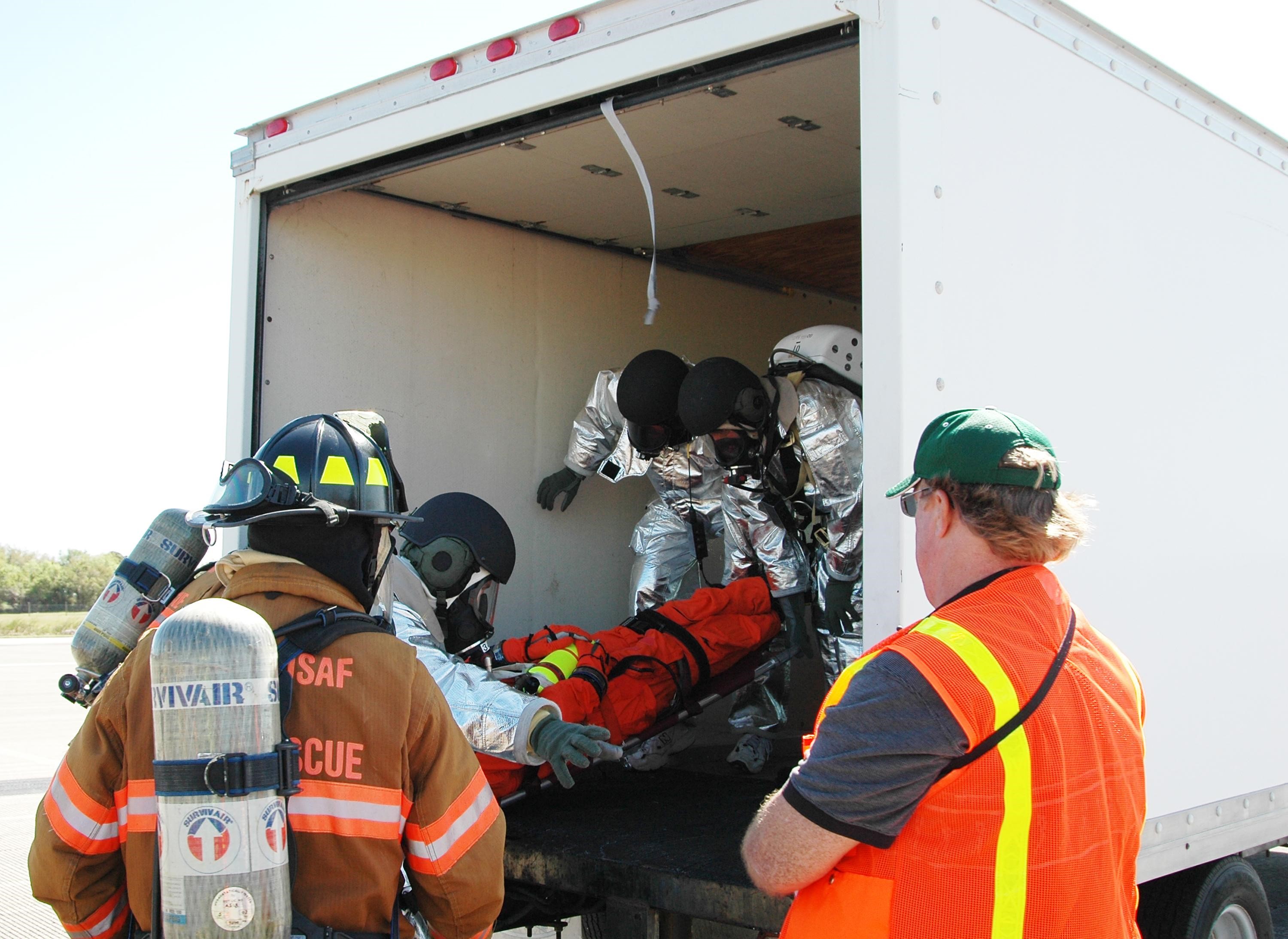 KENNEDY SPACE CENTER, FLA. - In a simulated emergency landing of a shuttle crew at NASA Kennedy Space Center's Shuttle Landing Facility, emergency rescue personnel place an "injured astronaut" into a rescue vehicle. Known as a Mode VI exercise, the operation uses volunteer workers from the Center to pose as astronauts. The purpose of the simulation is to exercise emergency preparedness personnel, equipment and facilities in rescuing astronauts from a downed orbiter and providing immediate medical attention. Photo credit: NASA/Kim Shiflett