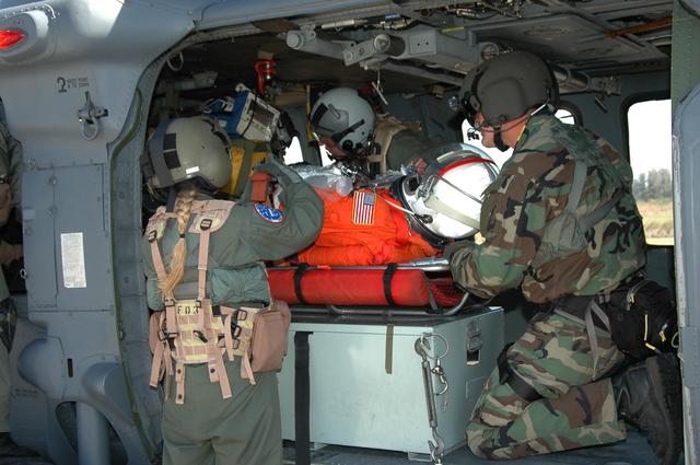 KENNEDY SPACE CENTER, FLA. - During a simulated emergency landing of a shuttle crew at NASA Kennedy Space Center's Shuttle Landing Facility, medevac personnel tend to an "injured astronaut" in the helicopter. The astronaut will be taken to an area hospital participating in the simulation. Known as a Mode VI exercise, the operation uses volunteer workers from the Center to pose as astronauts. The purpose of the simulation is to exercise emergency preparedness personnel, equipment and facilities in rescuing astronauts from a downed orbiter and providing immediate medical attention. Photo credit: NASA/Kim Shiflett