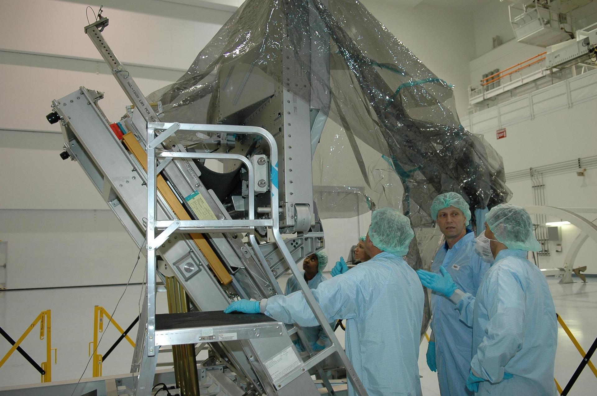 KENNEDY SPACE CENTER, FLA. - The crew for mission STS-121 is taking part in a Crew Equipment Interface Test (CEIT) inside the Space Station Processing Facility at NASA's Kennedy Space Center. Looking at the trailing umbilical system reel assembly that will be installed on the International Space Station are Mission Specialists Michael Fossum (on ladder), Lisa Nowak and Stephanie Wilson (below Fossum on floor). A CEIT provides hands-on experiences with equipment used on-orbit. Mission STS-121 is the second in the Return to Flight sequence and will carry on improvements that debuted during last year's STS-114 mission and build upon those tests. Launch is scheduled in July. Photo credit: NASA/Kim Shiflett