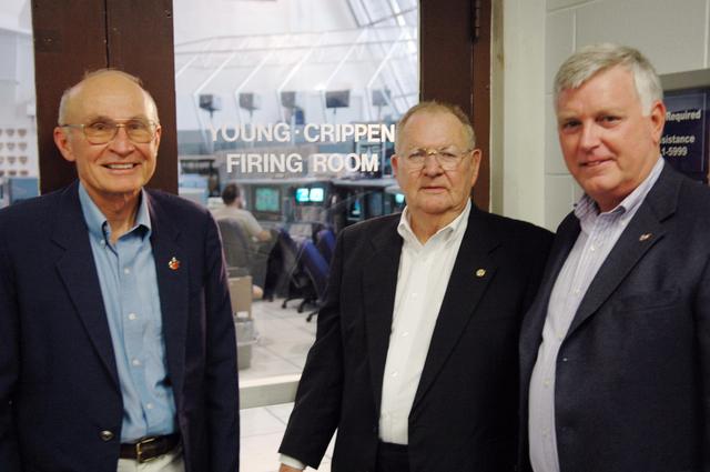 KENNEDY SPACE CENTER, FLA. - In tribute to the 25th anniversary of the first space shuttle flight, NASA's Kennedy Space Center has honored the crew of STS-1, Commander John Young and Pilot Robert Crippen, by dedicating the firing room that launched the historic flight as the "Young · Crippen Firing Room" (seen here). Making the dedication were (from left) the project flight engineer for Space Shuttle Columbia, Bob Sieck; the NASA test director for STS-1, Norm Carlson; and Center Director Jim Kennedy. Photo credit: NASA/Kim Shiflett