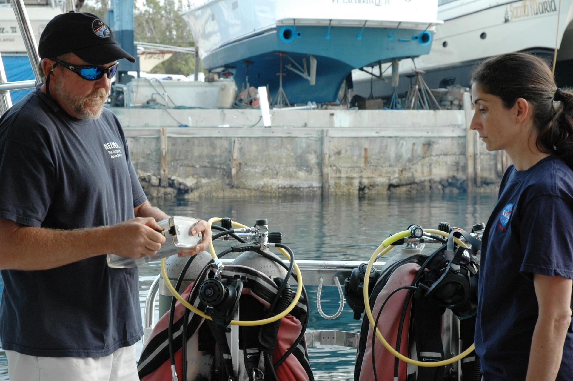 KENNEDY SPACE CENTER, FLA. -- Astronaut Nicole Stott is one of three astronauts taking part in the 17-day NASA Extreme Environment Mission Operations (NEEMO) project from the National Oceanic and Atmospheric Administration (NOAA) Aquarius Underwater Laboratory. At left is NEEMO instructor "Otter" Mark Rutten. The astronauts are testing space medicine concepts and moon-walking techniques. The 45-foot-long, 13-foot-diameter complex is three miles off Key Largo in the Florida Keys National Marine Sanctuary and anchored 62 feet below the surface. Canadian astronaut Dave Williams is leading the undersea mission, along with Stott and astronaut Ron Garan. Dr. Tim Broderick of the University of Cincinnati rounds out the crew.