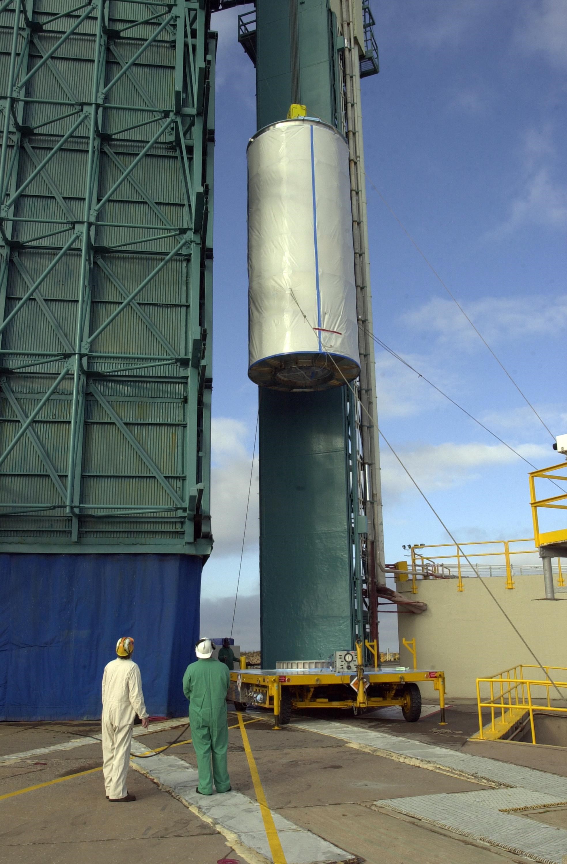 VANDENBERG AIR FORCE BASE, Calif. - On Space Launch Complex 2 at Vandenberg Air Force Base in California, the dual spacecraft CALIPSO and CloudSat, covered by a transport canister, is lifted up into the mobile service tower. There the spacecraft will be mated with a Boeing Delta II rocket for launch on April 21. CALIPSO stands for Cloud-Aerosol Lidar and Infrared Pathfinder Satellite Observation. It will fly in combination with the CloudSat satellite to provide never-before-seen 3-D perspectives of how clouds and aerosols form, evolve, and affect weather and climate. CALIPSO and CloudSat will join three other satellites in orbit to enhance understanding of climate systems. Launch of CALIPSO/CloudSat is scheduled for April 21.