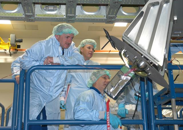 KENNEDY SPACE CENTER, FLA. - Mission STS-121 Pilot Mark Kelly (left) and Mission Specialist Piers Sellers (kneeling) get a close look at the Integrated Cargo Carrier at the SPACEHAB facility in Cape Canaveral during a Crew Equipment Interface Test. This test allows the astronauts to become familiar with equipment they will be using on their upcoming mission. STS-121 is scheduled to launch in July aboard Space Shuttle Discovery. Photo credit: NASA/Kim Shiflett