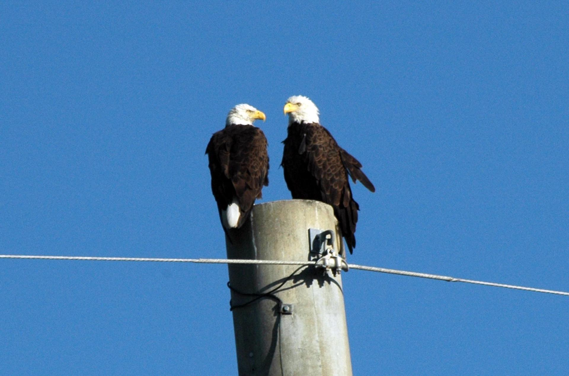 KENNEDY SPACE CENTER, FLA. - These bald eagles scan the landscape of Kennedy Space Center from the top of a utility pole on S.R. 3. There are a dozen active nests of bald eagles throughout the Merritt Island National Wildlife Refuge, which shares a boundary with the Center. Eagles' habitats are near lakes, rivers, marshes and seacoasts. Nests are masses of sticks, usually in the top of a tall tree. Even though they are fish eaters, bald eagles will take whatever prey is available and easiest to obtain. Bald eagles that live along the coast and on major lakes and rivers feed mainly on fish.