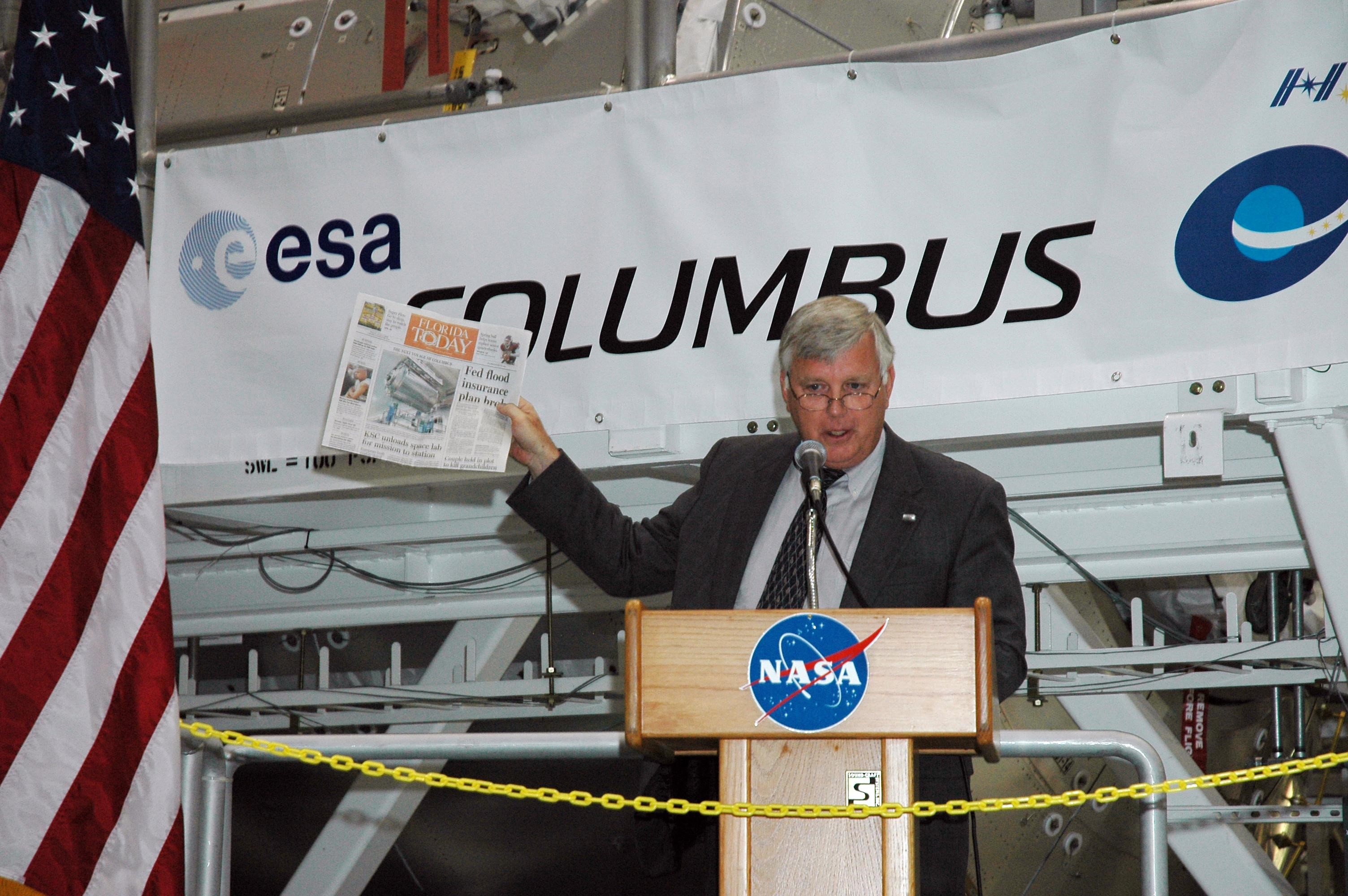 KENNEDY SPACE CENTER, FLA. - Jim Kennedy, director of NASA's Kennedy Space Center, addresses the audience attending a ceremony in the Space Station Processing Facility to welcome the European Space Agency's Columbus module. Columbus is the European Space Agency's research laboratory for the International Space Station. The module will be prepared in the SSPF for delivery to the space station on a future space shuttle mission. Columbus will expand the research facilities of the station and provide researchers with the ability to conduct numerous experiments in the life, physical and materials sciences. Photo credit: NASA/Amanda Diller