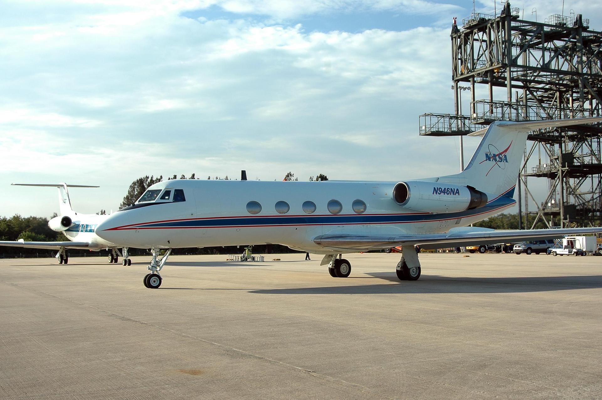 KENNEDY SPACE CENTER, FLA. - At the Shuttle Landing Facility, the Shuttle Training Aircraft (STA) waits for the STS-121 pilot and commander to begin their practice flights. The STA is a modified Grumman American Aviation-built Gulf Stream II jet that was modified to simulate an orbiter’s cockpit, motion and visual cues, and handling qualities. In flight, the STA duplicates the orbiter’s atmospheric descent trajectory from approximately 35,000 feet altitude to landing on a runway. Because the orbiter is unpowered during re-entry and landing, its high-speed glide must be perfectly executed the first time. Space Shuttle Discovery is scheduled to launch July 1 on mission STS-121. Photo credit: NASA/Kim Shiflett