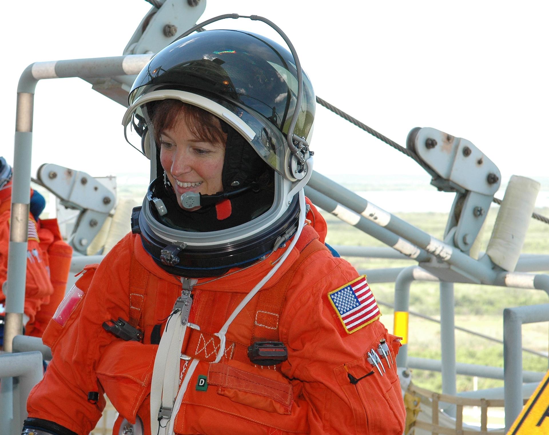KENNEDY SPACE CENTER, FLA. - STS-121 Mission Specialist Lisa Nowak takes part in emergency egress practice on Launch Pad 39B. She is taking part in Terminal Countdown Demonstration Test (TCDT) activities that include a simulated countdown culminating in main engine cutoff. Mission STS-121 is scheduled to be launched July 1. Photo credit: NASA/Kim Shiflett