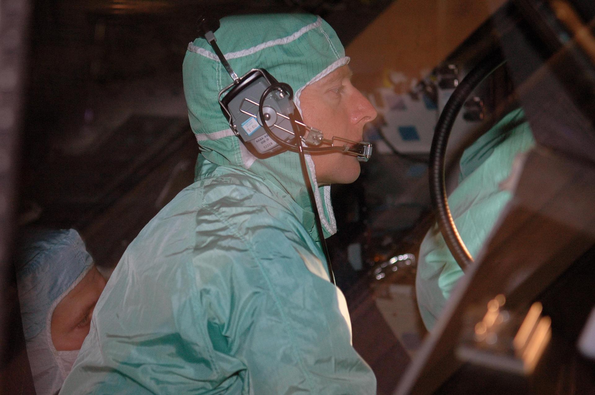 KENNEDY SPACE CENTER, FLA. - In the Orbiter Processing Facility, STS-115 Pilot Christopher Ferguson inspects the window of the cockpit in the orbiter Atlantis. The crew is at KSC for Crew Equipment Interface Test activities, which involve equipment familiarization and inspection, a routine part of astronaut training and launch preparations. The STS-115 mission will deliver the second port truss segment, the P3/P4 truss, to the International Space Station. The crew will attach the P3 to the first port truss segment, the P1 truss, as well as deploy solar array set 2A and 4A. Launch on Space Shuttle Atlantis is scheduled for late August. Photo credit: NASA/Kim Shiflett