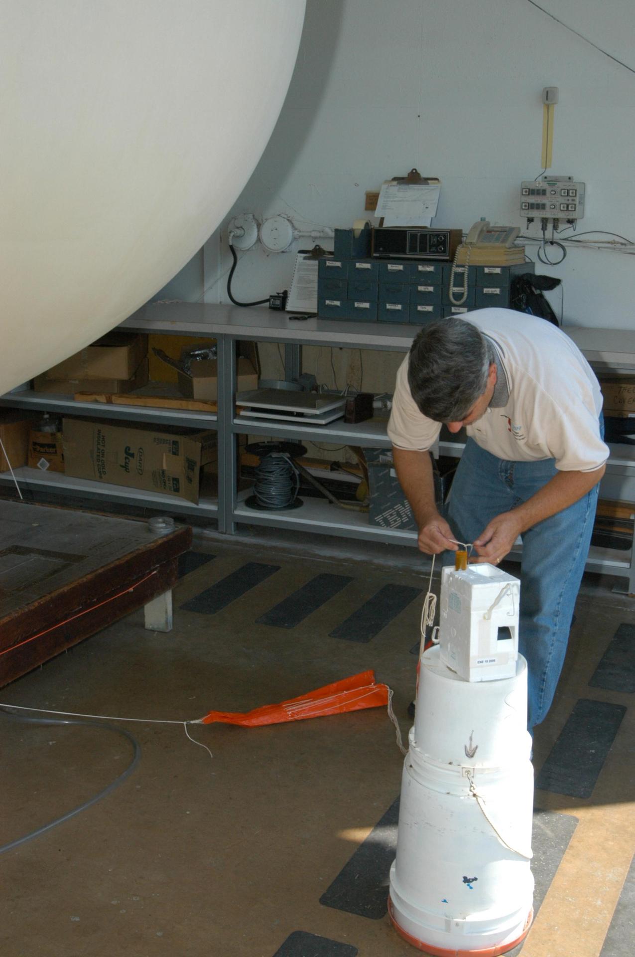 KENNEDY SPACE CENTER, FLA. - At the Cape Canaveral weather station in Florida, a member of the weather team prepares a Rawinsonde weather balloon for release. The release was planned as part of a media tour prior to the launch of Space Shuttle Discovery on mission STS-121 July 1. At the facility, which is operated by the U.S. Air Force 45th Weather Squadron, media saw the tools used by the weather team to create the forecast for launch day. They received a briefing on how the launch weather forecast is developed by Shuttle Weather Officer Kathy Winters and met the forecasters for the space shuttle and the expendable launch vehicles. Also participating were members of the Applied Meteorology Unit who provide special expertise to the forecasters by analyzing and interpreting unusual or inconsistent weather data. The media were able to see the release of the Rawinsonde weather balloon carrying instruments aloft to be used as part of developing the forecast. Photo credit: NASA/George Shelton
