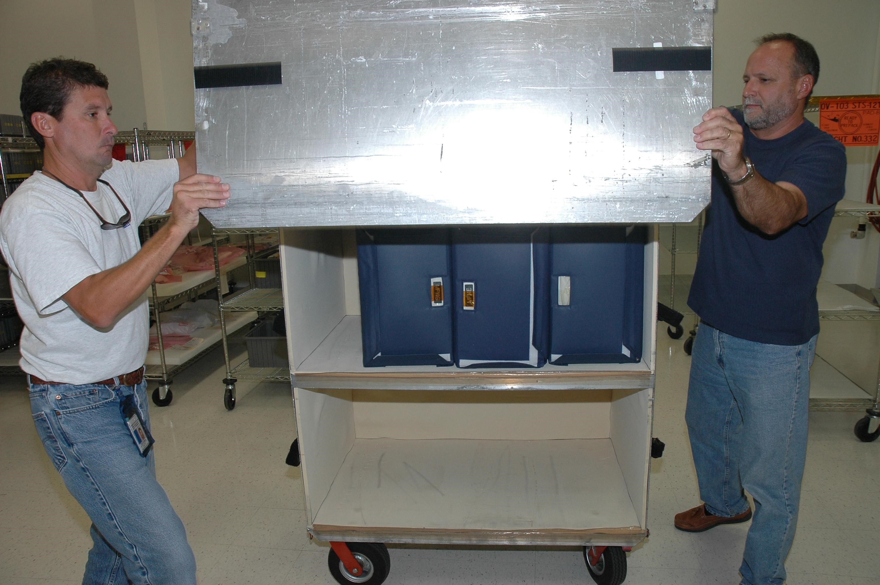 KENNEDY SPACE CENTER, FLA. - In the Space Station Processing Facility at NASA's Kennedy Space Center, flight crew systems technician Troy Mann and flight crew systems manager Jim Blake store the food containers that will be stowed on Space Shuttle Discovery for the flight of mission STS-121. The containers hold meals prepared for the mission crew. Mann and Blake are with United Space Alliance ground operations. Astronauts select their own menus from a large array of food items. Astronauts are supplied with three balanced meals, plus snacks. Foods flown on space missions are researched and developed at the Space Food Systems Laboratory at the Johnson Space Center (JSC) in Houston, which is staffed by food scientists, dietitians and engineers. Foods are analyzed through nutritional analysis, sensory evaluation, storage studies, packaging evaluations and many other methods. Each astronaut’s food is stored aboard the space shuttle and is identified by a colored dot affixed to each package. Launch of Space Shuttle Discovery on mission STS-121 is scheduled for July 1. Photo credit: NASA/Jack Pfaller
