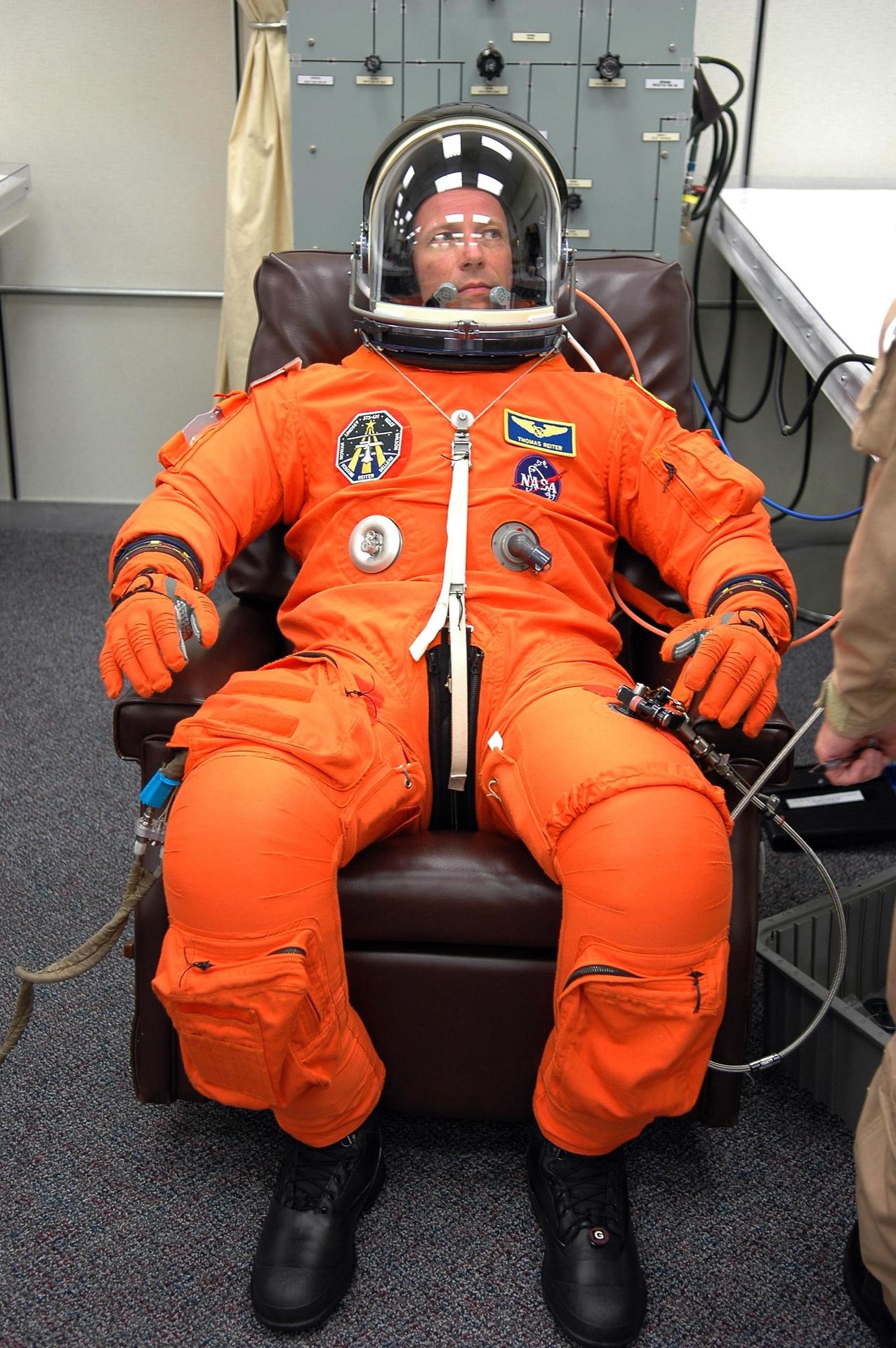 KENNEDY SPACE CENTER, FLA. - The STS-121 crew are donning their orange launch and entry suits for launch today on Space Shuttle Discovery. Here, Mission Specialist Thomas Reiter, who represents the European Space Agency, is ready to go. Reiter is making his first space shuttle flight. The launch is the 115th shuttle flight and the 18th U.S. flight to the International Space Station. During the 12-day mission, the STS-121 crew will test new equipment and procedures to improve shuttle safety, as well as deliver supplies and make repairs to the International Space Station. Photo credit: NASA/Kim Shiflett