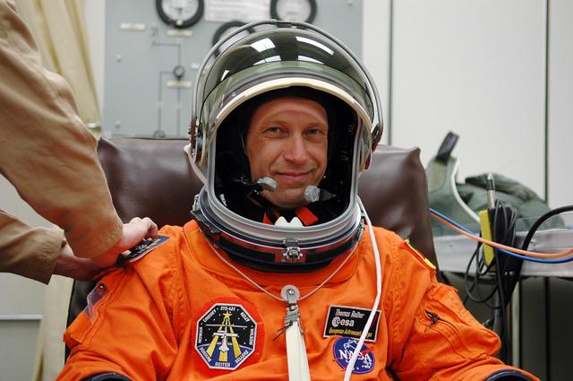 KENNEDY SPACE CENTER, FLA. - Prior to the third launch attempt on mission STS-121, Mission Specialist Thomas Reiter is suiting up before heading to Launch Pad 39B. The July 2 launch attempt was scrubbed due to the presence of showers and thunderstorms within the surrounding area of the launch site. The launch of Space Shuttle Discovery on mission STS-121 is the 115th shuttle flight and the 18th U.S. flight to the International Space Station. During the 12-day mission, the STS-121 crew will test new equipment and procedures to improve shuttle safety, as well as deliver supplies and make repairs to the International Space Station. Photo credit: NASA/Kim Shiflett