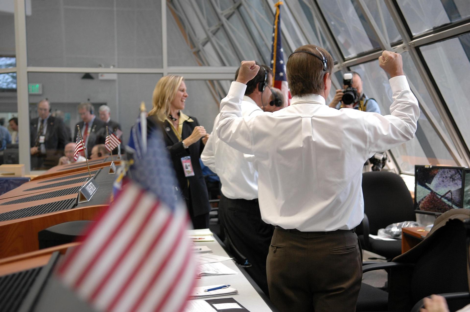 KENNEDY SPACE CENTER, FLA. - In Firing Room 4 of the Launch Control Center, Shuttle Launch Director Mike Leinbach (foreground) cheers over the successful liftoff of Space Shuttle Discovery, watching it rocket through the sky on mission STS-121 -- the first ever Independence Day launch of a space shuttle. At far left is Stephanie Stilson, NASA flow director in the Process Integration Branch of the Shuttle Processing Directorate, who began conducting Discovery's processing operations in December 2000. Liftoff was on-time at 2:38 p.m. EDT. During the 12-day mission, the STS-121 crew of seven will test new equipment and procedures to improve shuttle safety, as well as deliver supplies and make repairs to the International Space Station. Landing is scheduled for July 16 or 17 at Kennedy's Shuttle Landing Facility. Photo credit: NASA/Kim Shiflett
