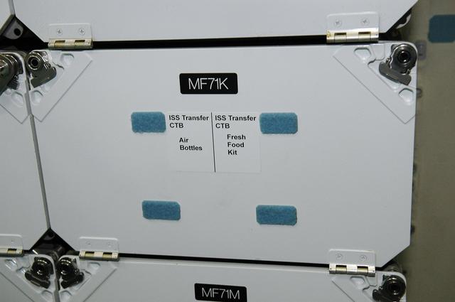 KENNEDY SPACE CENTER, FLA. - Inside Space Shuttle Discovery, these lockers store food containers for use on mission STS-121. Astronauts are supplied with three balanced meals, plus snacks. Foods flown on space missions are researched and developed at the Space Food Systems Laboratory at the Johnson Space Center (JSC) in Houston, which is staffed by food scientists, dietitians and engineers. Each astronaut’s food stored aboard the space shuttle is identified by a colored dot affixed to each package. Launch of Space Shuttle Discovery on mission STS-121 is scheduled for July 1. Photo credit: NASA/Kim Shiflett