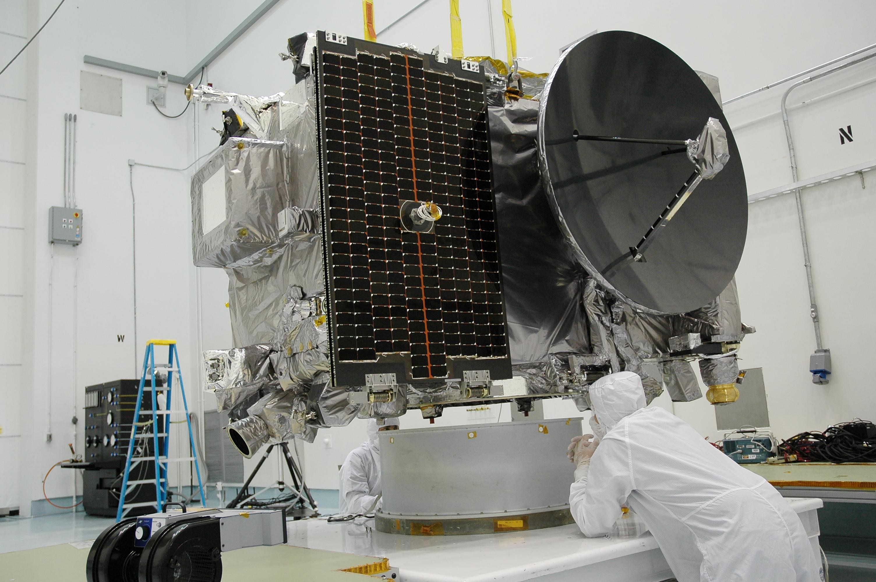 KENNEDY SPACE CENTER, FLA. - In the hazardous processing facility at Astrotech Space Operations in Titusville, Fla., technicians begin attaching an overhead crane to Observatory A of the STEREO spacecraft. The observatory will be lifted onto a scale for weight measurements and later will be fueled. STEREO stands for Solar Terrestrial Relations Observatory. The STEREO mission is the first to take measurements of the sun and solar wind in 3-dimension. This new view will improve our understanding of space weather and its impact on the Earth. STEREO is expected to lift off aboard a Boeing Delta II rocket no earlier than Aug. 1. Photo credit: NASA/Jack Pfaller