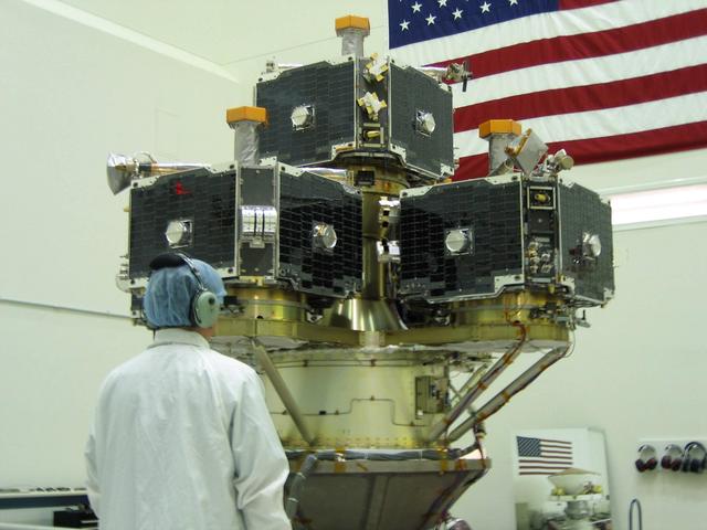 VANDENBERG AIR FORCE BASE, CALIF. -- The probe carrier assembly on the THEMIS spacecraft undergoes a vibration test (Z-axis). THEMIS, which stands for Time History of Events and Macroscale Interactions during Substorms, comprises five identical probes that will study the dynamic and colorful eruptions of auroras. THEMIS is scheduled to launch Oct. 19 from Cape Canaveral Air Force Station in Florida.