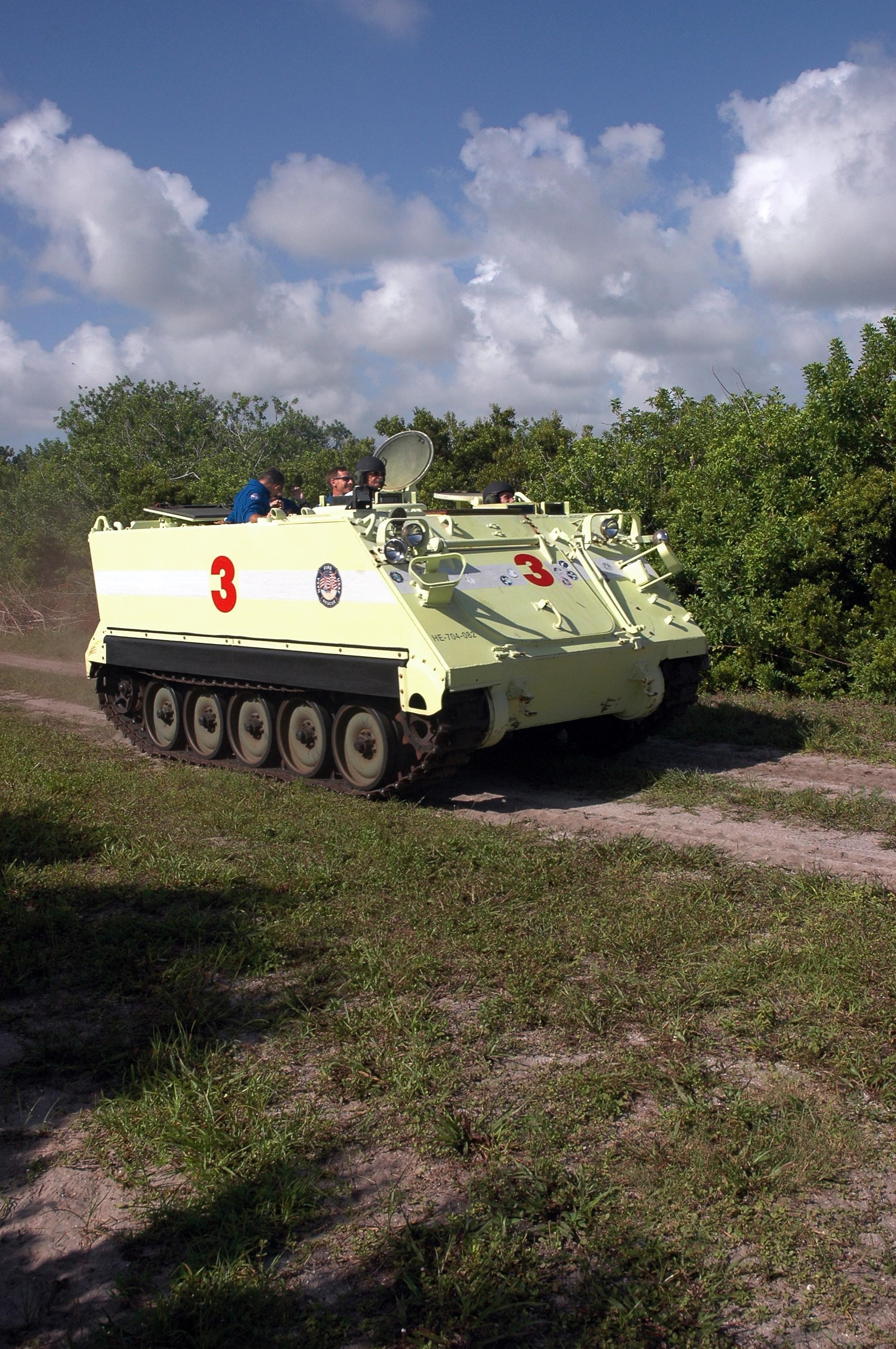 KENNEDY SPACE CENTER, FLA. - STS-115 Mission Specialist Steven MacLean takes his turn driving the M-113 armored personnel carrier. STS-115 Mission Specialist Steven MacLean takes his turn driving the M-113 armored personnel carrier. Passengers on the carrier are Mission Specialists Daniel Burbank and Heidemarie Stefanyshyn-Piper, Pilot Christopher Ferguson and Capt. George Hoggard, who is astronaut rescue team leader. MacLean represents the Canadian Space Agency. The STS-115 crew are at NASA's Kennedy Space Center for Terminal Countdown Demonstration Test activities such as the M-113 training. They will also practice emergency egress from the launch pad and take part in a simulated launch countdown. Liftoff of mission STS-115 aboard Space Shuttle Atlantis is scheduled in a window beginning Aug. 27. Photo credit: NASA/Cory Huston