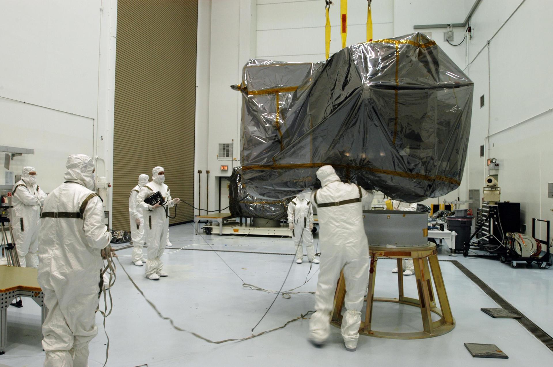 KENNEDY SPACE CENTER, FLA. - At Astrotech Space Operations in Titusville, Fla., workers prepare one of the STEREO observatories that will be lifted and moved. It will be mated to the other observatory, in the background, for launch. STEREO, which stands for Solar Terrestrial Relations Observatory, is the first to take measurements of the sun and solar wind in 3-dimension. This new view will improve our understanding of space weather and its impact on the Earth. STEREO is expected to lift off aboard a Boeing Delta II rocket from Launch Pad 17-B at Cape Canaveral Air Force Station on Aug. 31. Photo credit: NASA/George Shelton