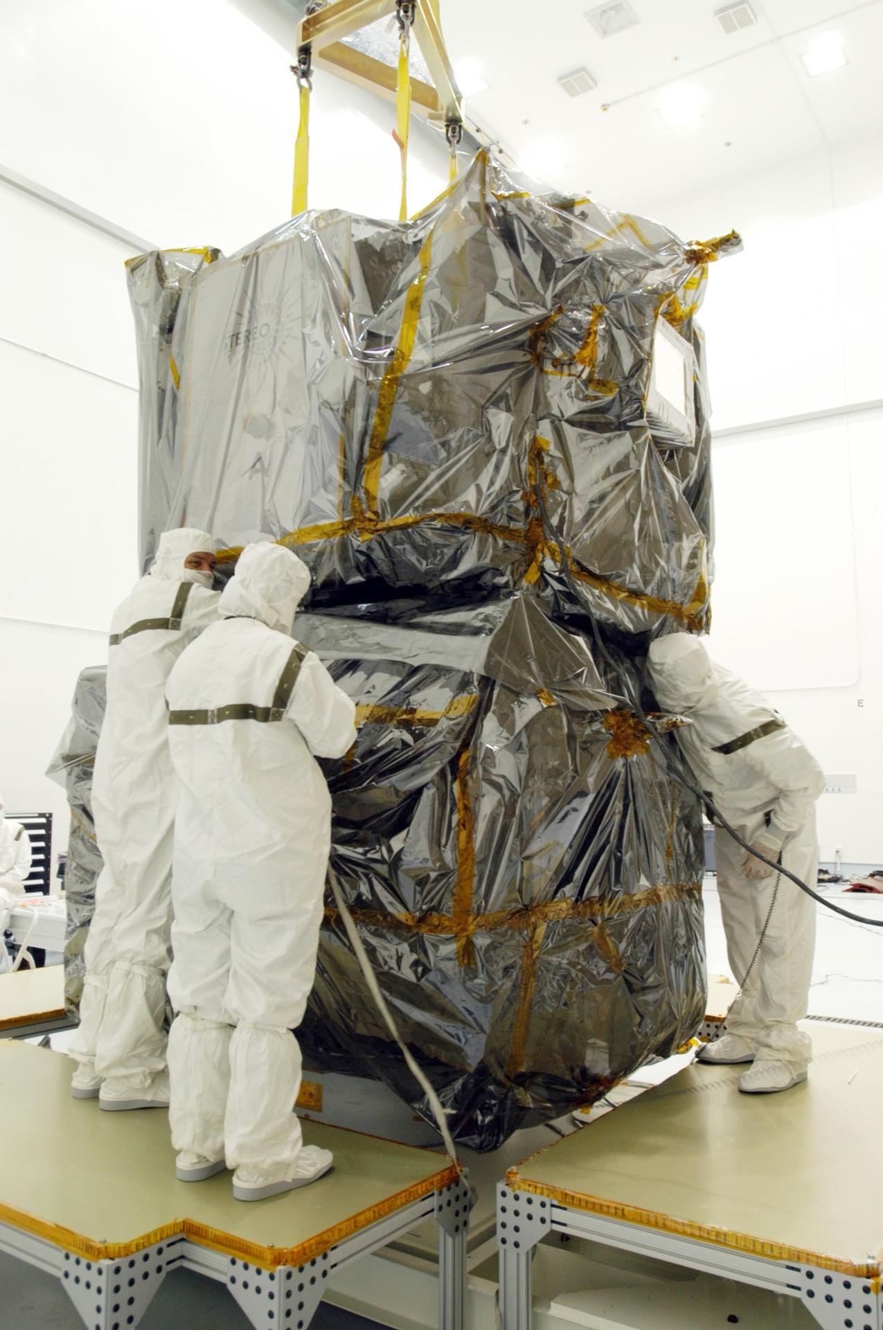 KENNEDY SPACE CENTER, FLA. - At Astrotech Space Operations in Titusville, Fla., workers check the mating of the two STEREO observatories, which is the launch configuration. STEREO, which stands for Solar Terrestrial Relations Observatory, is the first to take measurements of the sun and solar wind in 3-dimension. This new view will improve our understanding of space weather and its impact on the Earth. STEREO is expected to lift off aboard a Boeing Delta II rocket from Launch Pad 17-B at Cape Canaveral Air Force Station on Aug. 31. Photo credit: NASA/George Shelton