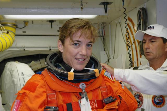 KENNEDY SPACE CENTER, FLA. - The STS-115 crew members complete their suitup in the White Room before entering Space Shuttle Atlantis on Launch Pad 39B for a simulated launch countdown. Shown here is being helped by the closeout crew is Mission Specialist Heidemarie Stefanyshyn-Piper. The White Room, which is located at the end of the orbiter access arm, allows entry into the orbiter through the crew access hatch. The mission crew is at KSC for Terminal Countdown Demonstration Test (TCDT) activities that are preparation for launch. Liftoff of Atlantis is scheduled to take place in a window that opens Aug. 27. During their 11-day mission to the International Space Station, the STS-115 crew will continue construction of the station and attach the payload elements, the Port 3/4 truss segment with its two large solar arrays. Photo credit: NASA/Jim Grossmann