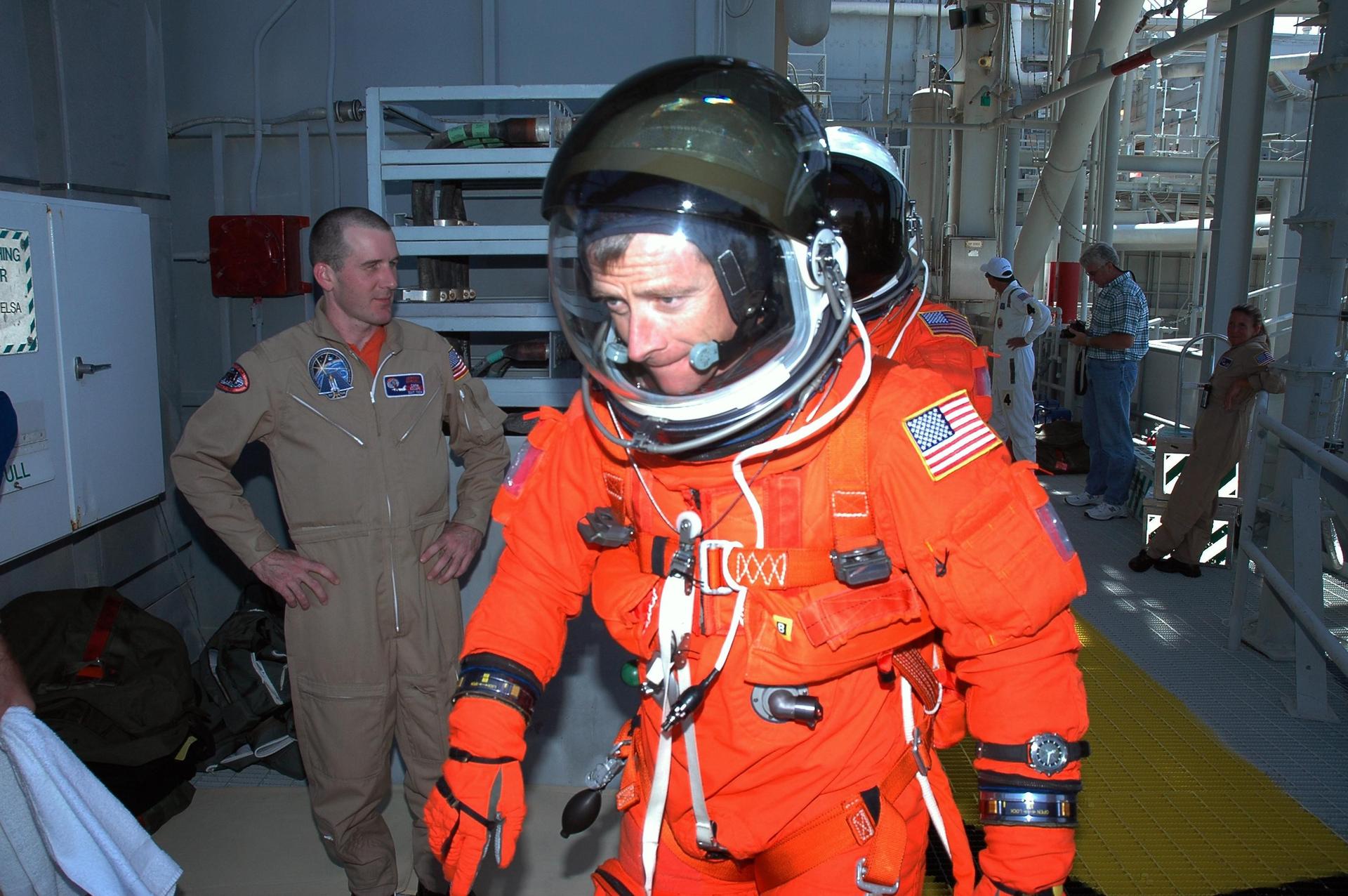 KENNEDY SPACE CENTER, FLA. - STS-115 Pilot Christopher Ferguson, followed by Commander Brent Jett, head for the slidewire baskets on Launch Pad 39B, practicing emergency egress procedures. The activity follows a simulated launch countdown, part of Terminal Countdown Demonstration Test activities. The TCDT is a prelaunch preparation for the mission that is scheduled to lift off in a window opening Aug. 27. During their 11-day mission to the International Space Station, the STS-115 crew will continue construction of the station and attach the payload elements, the Port 3/4 truss segment with its two large solar arrays. Photo credit: NASA/Cory Huston