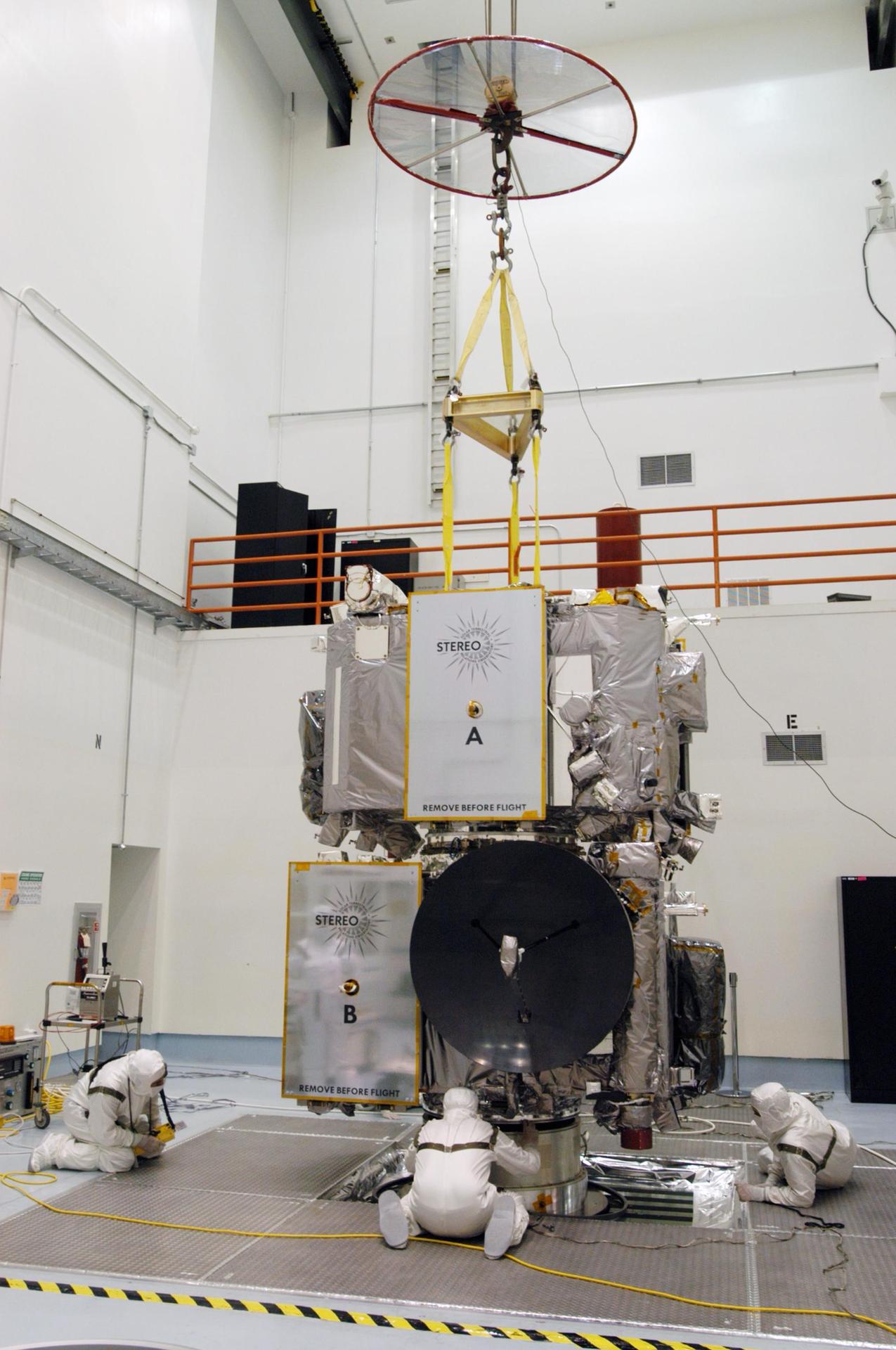 KENNEDY SPACE CENTER, FLA. - Technicians inside the Astrotech facility in Titusville, Florida, move the STEREO spacecraft to the spin table. The twin observatories will undergo a spin test to check balance and alignment in preparation for flight. STEREO stands for Solar Terrestrial Relations Observatory. The STEREO mission is the first to take measurements of the sun and solar wind in 3-dimension. This new view will improve our understanding of space weather and its impact on the Earth. STEREO is expected to lift off on Aug. 31, from Launch Pad 17-B on Cape Canaveral Air Force Station in Florida. Photo credit: NASA/George Shelton.