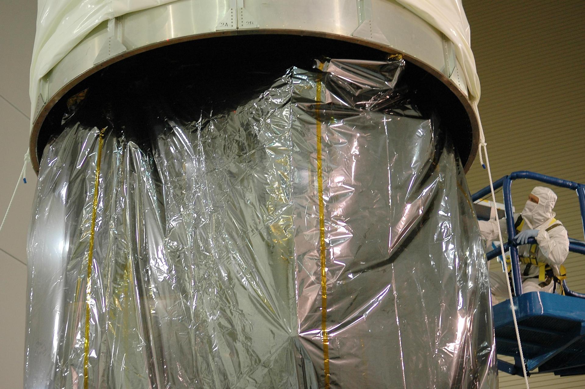 KENNEDY SPACE CENTER, FLA. - At Astrotech Space Operations in Titusville, Fla., a worker examines the STEREO spacecraft as the upper portion of the transportation canister is lowered over the top. When the entire configuration is encased, it will be moved to Launch Pad 17-B at Cape Canaveral Air Force Station. STEREO stands for Solar Terrestrial Relations Observatory and comprises two spacecraft. The STEREO mission is the first to take measurements of the sun and solar wind in 3-dimension. This new view will improve our understanding of space weather and its impact on the Earth. STEREO is expected to lift off Aug. 31. Photo credit: NASA/Kim Shiflett