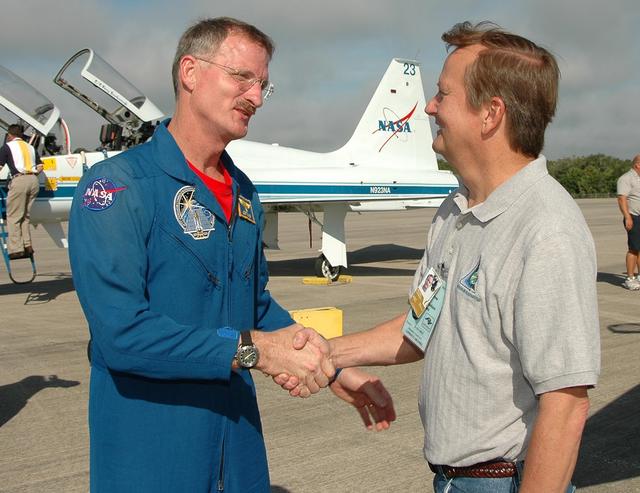 KENNEDY SPACE CENTER, FLA. - The crew of mission STS-115 arrives at NASA Kennedy Space Center's Shuttle Landing Facility to prepare for a second launch attempt on Sept. 6 to the International Space Station. Seen here is Mission Specialist Joe Tanner (left) shaking hands with Shuttle Launch Director Mike Leinbach. Mission managers cancelled Atlantis' first launch campaign due to a lightning strike at the pad and the passage of Tropical Storm Ernesto along Florida's east coast. The mission will deliver and install the 17-and-a-half-ton P3/P4 truss segment to the port side of the integrated truss system on the orbital outpost. The truss includes a new set of photovoltaic solar arrays. When unfurled to their full length of 240 feet, the arrays will provide additional power for the station in preparation for the delivery of international science modules over the next two years. STS-115 is expected to last 11 days and includes three scheduled spacewalks. Photo credit: NASA/Kim Shiflett