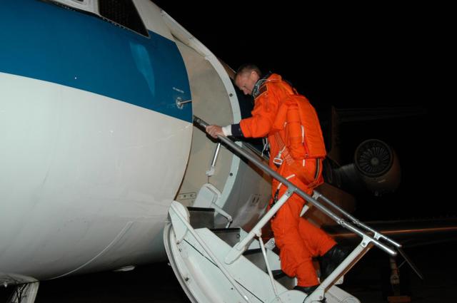 KENNEDY SPACE CENTER, FLA. - On NASA Kennedy Space Center's Shuttle Landing Facility, STS-115 Commander Brent Jett boards the Shuttle Training Aircraft to practice landing the shuttle. STA practice is part of launch preparations. The STA is a Grumman American Aviation-built Gulf Stream II jet that was modified to simulate an orbiter’s cockpit, motion and visual cues, and handling qualities. In flight, the STA duplicates the orbiter’s atmospheric descent trajectory from approximately 35,000 feet altitude to landing on a runway. Because the orbiter is unpowered during re-entry and landing, its high-speed glide must be perfectly executed the first time. Mission STS-115 is scheduled to lift off about 12:29 p.m. Sept. 6. Mission managers cancelled Atlantis' first launch campaign due to a lightning strike at the pad and the passage of Tropical Storm Ernesto along Florida's east coast. The mission will deliver and install the 17-and-a-half-ton P3/P4 truss segment to the port side of the integrated truss system on the orbital outpost. The truss includes a new set of photovoltaic solar arrays. When unfurled to their full length of 240 feet, the arrays will provide additional power for the station in preparation for the delivery of international science modules over the next two years. STS-115 is expected to last 11 days and includes three scheduled spacewalks. Photo credit: NASA/Kim Shiflett