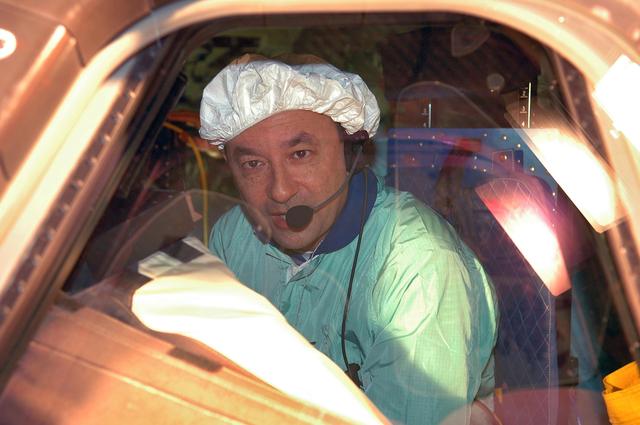 KENNEDY SPACE CENTER, FLA. - In the Orbiter Processing Facility, STS-116 Commander Mark Polansky checks the cockpit window of Discovery as part of a Crew Equipment Interface Test (CEIT). A CEIT allows astronauts to become familiar with equipment and hardware they will use on the mission. STS-116 will be mission No. 20 to the International Space Station and construction flight 12A.1. The mission payload is the SPACEHAB module, the P5 integrated truss structure and other key components. Launch is scheduled for no earlier than Dec. 7. Photo credit: NASA/Kim Shiflett