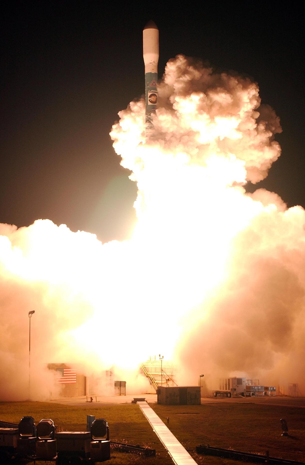 KENNEDY SPACE CENTER, FLA. - The Delta II rocket carrying the STEREO spacecraft on top streaks through the smoke as it climbs to orbit. Liftoff from Launch Pad 17-B at Cape Canaveral Air Force Station was at 8:52 p.m. EDT. STEREO (Solar Terrestrial Relations Observatory) is a two-year mission using two nearly identical observatories, one ahead of Earth in its orbit and the other trailing behind. The duo will provide 3-D measurements of the sun and its flow of energy, enabling scientists to study the nature of coronal mass ejections and why they happen. The ejections are a major source of the magnetic disruptions on Earth and are a key component of space weather. The disruptions can greatly effect satellite operations, communications, power systems, humans in space and global climate. Designed and built by the Johns Hopkins University Applied Physics Laboratory (APL) , the STEREO mission is being managed by NASA Goddard Space Flight Center. APL will maintain command and control of the observatories throughout the mission, while NASA tracks and receives the data, determines the orbit of the satellites, and coordinates the science results.