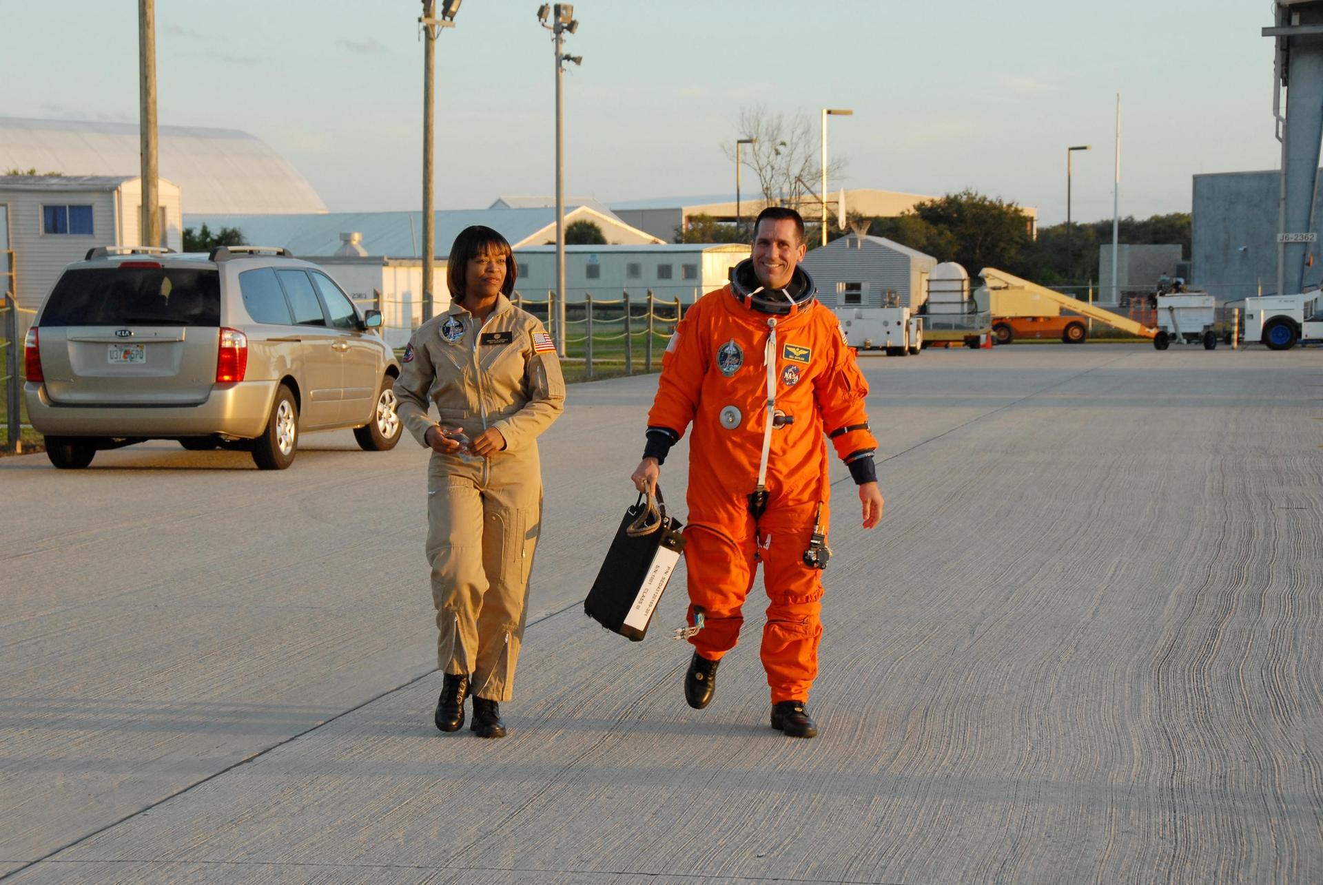KENNEDY SPACE CENTER, FLA. -- STS-116 Pilot William Oefelein (right) is suited and ready to begin practice flights on the shuttle training aircraft (STA) two days before launch. The STA is a Grumman American Aviation-built Gulf Stream II jet that was modified to simulate an orbiter's cockpit, motion and visual cues, and handling qualities. In flight, the STA duplicates the orbiter's atmospheric descent trajectory from approximately 35,000 feet altitude to landing on a runway. Because the orbiter is unpowered during re-entry and landing, its high-speed glide must be perfectly executed the first time. Launch of Space Shuttle Discovery on mission STS-116 is scheduled for 9:35 p.m. Dec. 7. On the mission, the STS-116 crew will deliver truss segment, P5, to the International Space Station and begin the intricate process of reconfiguring and redistributing the power generated by two pairs of U.S. solar arrays. The P5 will be mated to the P4 truss that was delivered and attached during the STS-115 mission in September. Photo credit: NASA/Kim Shiflett