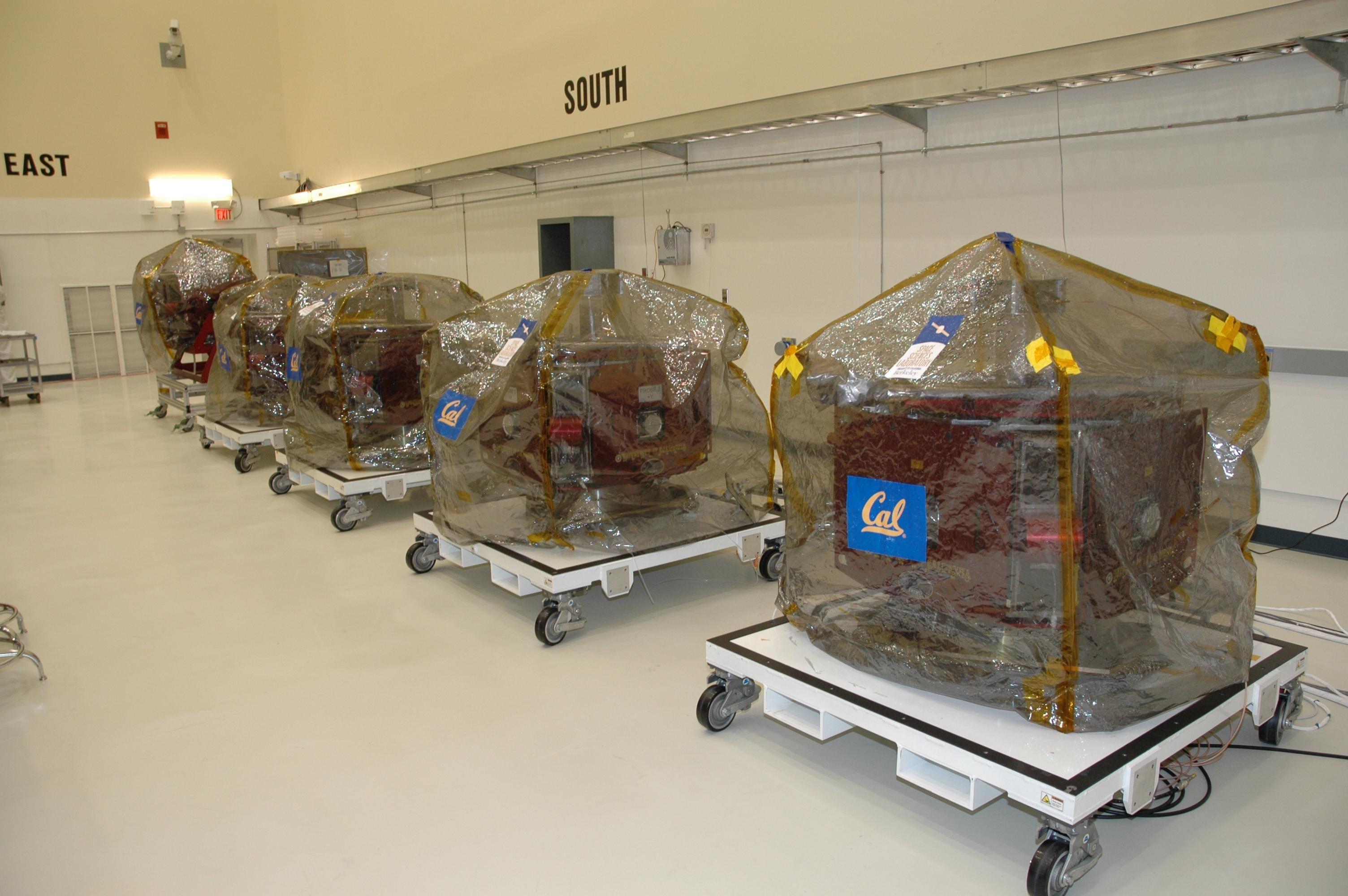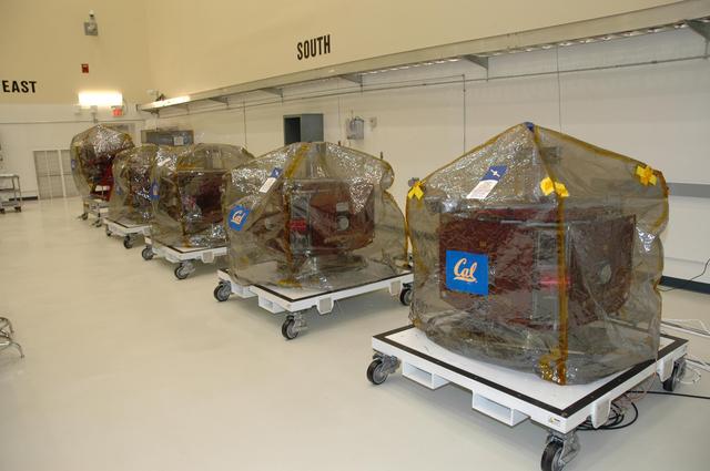 KENNEDY SPACE CENTER, FLA. -- At Astrotech Space Operations in Titusville, Fla., the five probes of the THEMIS spacecraft remain under cover. The probes will undergo weeks of testing and launch preparations. This includes a functional performance test to verify the state of health of each of the five probes, installation of bolt cutters that will separate each probe from the payload carrier, and pressurization and leak checks of the reaction control systems. THEMIS consists of five identical probes, the largest number of scientific satellites ever launched into orbit aboard a single rocket. This unique constellation of satellites will resolve the tantalizing mystery of what causes the spectacular sudden brightening of the aurora borealis and aurora australis - the fiery skies over the Earth's northern and southern polar regions. These lights are the visible manifestations of invisible energy releases, called geomagnetic substorms, in near-Earth space. THEMIS will not only seek to answer where and when substorms start, but will also provide clues as to how and why these space storms create havoc on satellites, terrestrial power grids, and communication systems. THEMIS is scheduled to launch Feb. 15 from Cape Canaveral Air Force Station. Photo credit: NASA/Jack Pfaller