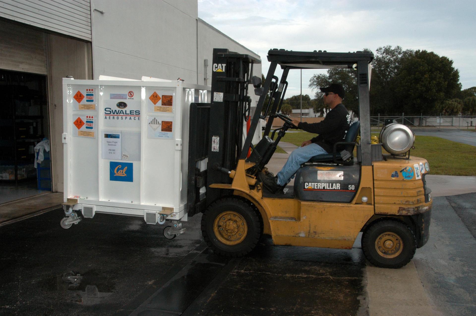 KENNEDY SPACE CENTER, FLA. -- At Astrotech Space Operations in Titusville, Fla., one of the five THEMIS probes is moved out of the facility and will be transported to the hazardous processing facility. There the probes will be placed on a stand in preparation for fueling operations. Once fueling is complete, each probe will be weighed and individually mated to the payload carrier before pyrotechnics are installed. The fully integrated THEMIS payload is then ready for spin-balance testing and weighing. The final milestone is mating THEMIS to its upper stage booster. THEMIS consists of five identical probes, the largest number of scientific satellites ever launched into orbit aboard a single rocket. This unique constellation of satellites will resolve the tantalizing mystery of what causes the spectacular sudden brightening of the aurora borealis and aurora australis - the fiery skies over the Earth's northern and southern polar regions. These lights are the visible manifestations of invisible energy releases, called geomagnetic substorms, in near-Earth space. THEMIS will not only seek to answer where and when substorms start, but will also provide clues as to how and why these space storms create havoc on satellites, terrestrial power grids, and communication systems. THEMIS will be transported to Pad 17-B at Cape Canaveral Air Force Station on February 1 for mating to the Delta II rocket. Launch is scheduled for Feb. 15. Photo credit: NASA/George Shelton