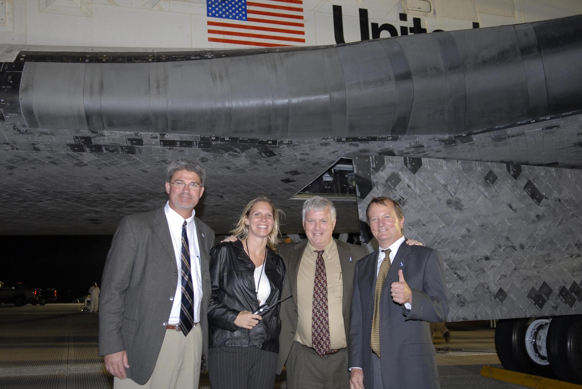 KENNEDY SPACE CENTER, FLA. -- Deputy Center Director Bill Parsons, Discovery Flow Director Stephanie Stilson, Center Director Jim Kennedy and Launch Director Mike Leinbach pose for the camera beneath Space Shuttle Discovery during post-landing inspections following mission STS-116 on Runway 15 at NASA Kennedy Space Center's Shuttle Landing Facility. During the STS-116 mission, three spacewalks attached the P5 integrated truss structure to the station, and completed the rewiring of the orbiting laboratory's power system. A fourth spacewalk retracted a stubborn solar array. Main gear touchdown was at 5:32 p.m. EST. Nose gear touchdown was at 5:32:12 p.m. and wheel stop was at 5:32:52 p.m. At touchdown -- nominally about 2,500 ft. beyond the runway threshold -- the orbiter is traveling at a speed ranging from 213 to 226 mph. Discovery traveled 5,330,000 miles, landing on orbit 204. Mission elapsed time was 12 days, 20 hours, 44 minutes and 16 seconds. This is the 64th landing at KSC. Photo credit: NASA/Kim Shiflett
