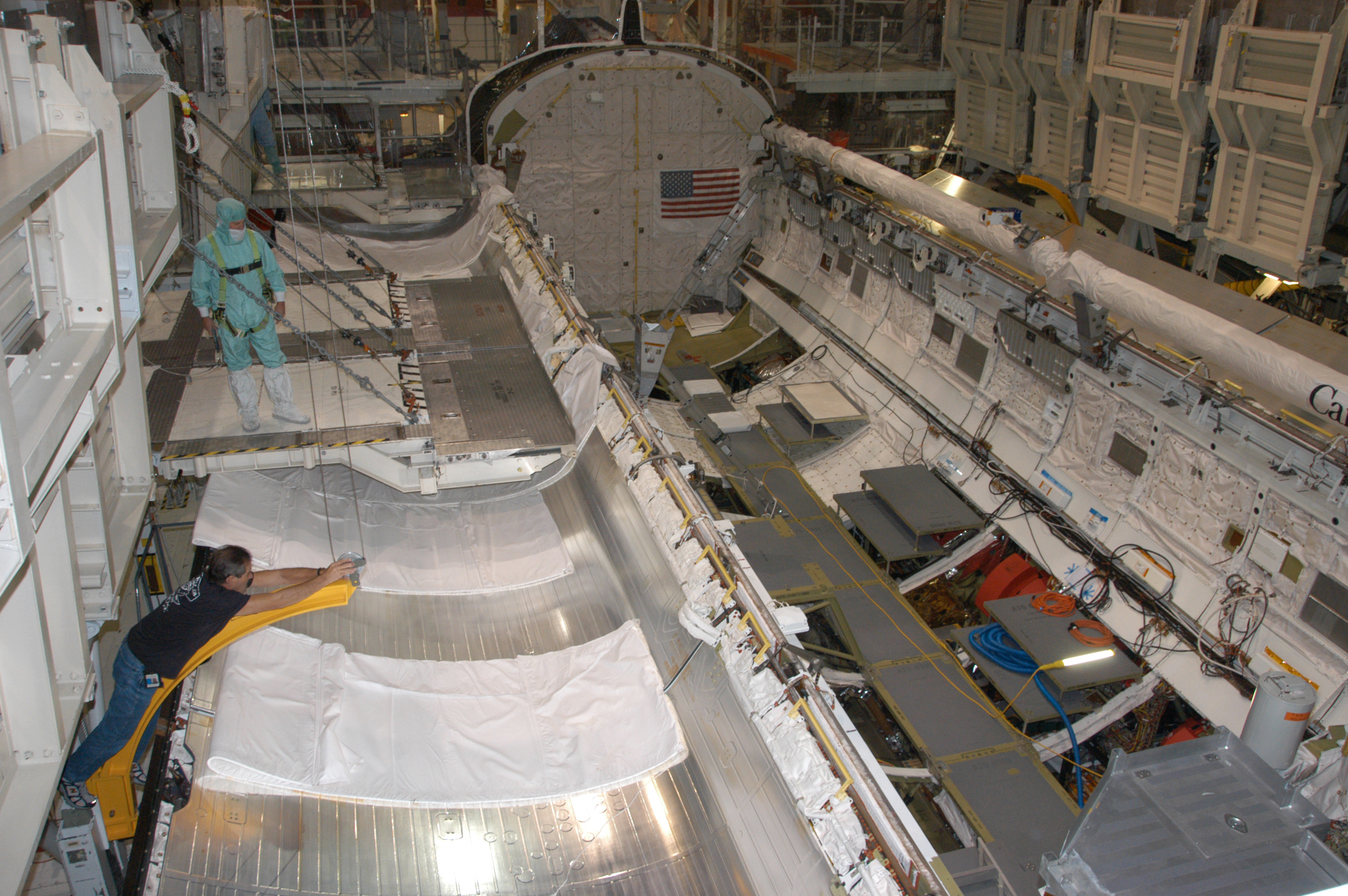 Endeavour's payload bay is open for payload configuration work in Orbiter Processing Facility bay 2. The orbiter is the vehicle designated for mission STS-118, scheduled to launch in late June. The mission will continue space station construction by delivering a third starboard truss segment, S5, as well as carrying the External Stowage Platform 3. The crew comprises six astronauts: Commander Scott Kelly, Pilot Charles Hobaugh and Mission Specialists Dr. Dafydd (Dave) Williams, Barbara Morgan, Richard Mastracchio and Tracy Caldwell. Williams represents the Canadian Space Agency.