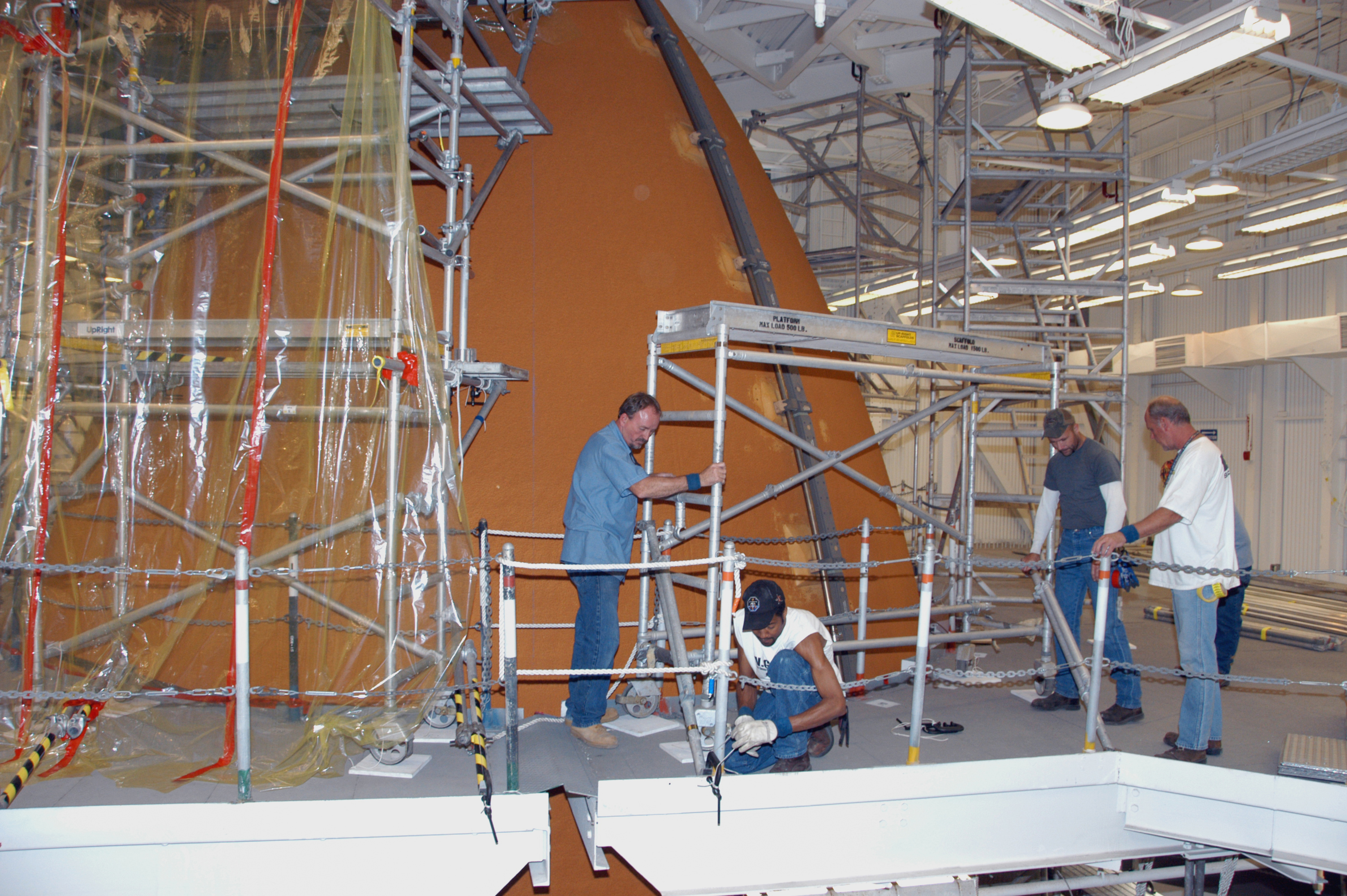 On an upper level of high bay 1 of the Vehicle Assembly Building, technicians secure protective material around Atlantis' external tank. The preparations are for future repair work of the hail damage that happened Feb. 27. A severe thunderstorm with golf ball-sized hail caused visible divots in the giant tank's foam insulation and minor surface damage to about 26 heat shield tiles on the shuttle's left wing. Further evaluation of the tank is necessary to get an accurate accounting of foam damage and determine the type of repair required and the time needed for that work. A new target launch date has not been determined, but teams will focus on preparing Atlantis for liftoff in late April on mission STS-117.