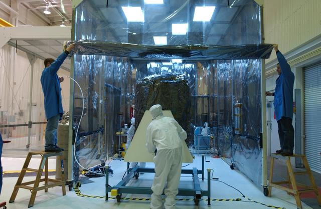 In Building 1555 at North Vandenberg Air Force Base, workers prepare the area where a partial deployment of the solar arrays on the AIM spacecraft will take place. The AIM spacecraft will fly three instruments designed to study polar mesospheric clouds located at the edge of space, 50 miles above the Earth's surface in the coldest part of the planet's atmosphere. The mission's primary goal is to explain why these clouds form and what has caused them to become brighter and more numerous and appear at lower latitudes in recent years. AIM's results will provide the basis for the study of long-term variability in the mesospheric climate and its relationship to global climate change. AIM is scheduled to be mated to the Pegasus XL during the second week of April, after which final inspections will be conducted. Launch is scheduled for April 25.