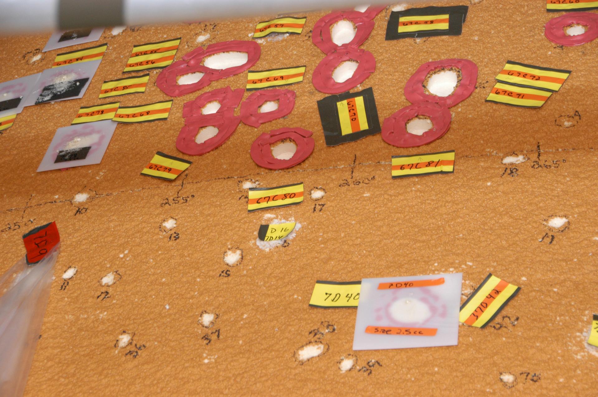 In the Vehicle Assembly Building, markers show the hail damage being repaired on the external tank of Space Shuttle Atlantis. The white hole with a red circle around it is a hole prepared for molding and material application. The red material is sealant tape so the mold doesn't leak when the foam rises against the mold. The white/ translucent square mold is an area where the foam has been applied and the foam has risen and cured against the mold surface. The area will be de-molded and sanded flush the with adjacent area. In late February, Atlantis' external tank received hail damage during a severe thunderstorm that passed through the Kennedy Space Center Launch Complex 39 area. The hail caused visible divots in the giant tank's foam insulation as well as minor surface damage to about 26 heat shield tiles on the shuttle's left wing. The March launch was postponed and has not yet been rescheduled due to the repair process.