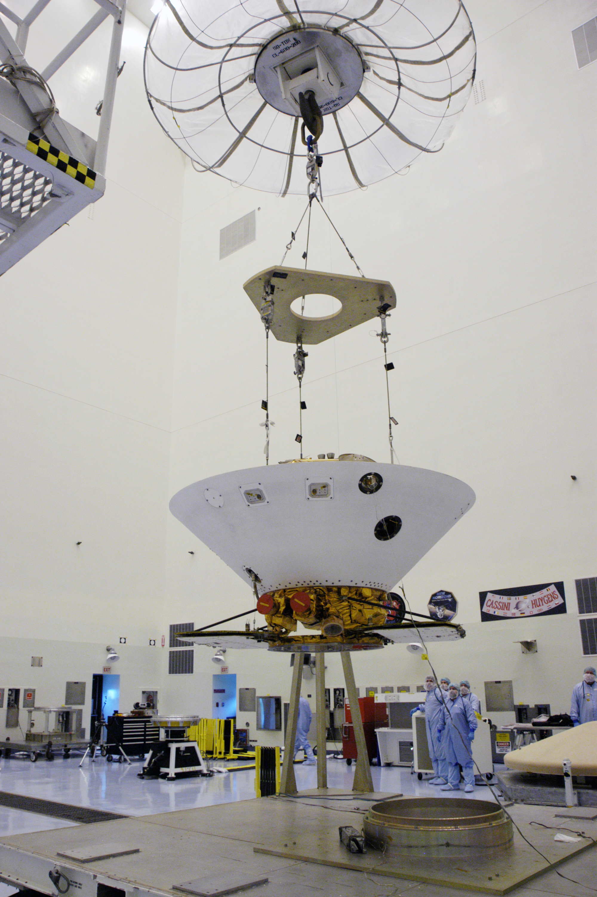 An overhead crane lifts the backshell with the Phoenix Mars Lander inside off its work stand in the Payload Hazardous Servicing Facility. The spacecraft is being moved to a spin table (back left) for spin testing. The Phoenix mission is the first project in NASA's first openly competed program of Mars Scout missions. Phoenix will land in icy soils near the north polar permanent ice cap of Mars and explore the history of the water in these soils and any associated rocks, while monitoring polar climate. Landing is planned in May 2008 on arctic ground where a mission currently in orbit, Mars Odyssey, has detected high concentrations of ice just beneath the top layer of soil. It will serve as NASA's first exploration of a potential modern habitat on Mars and open the door to a renewed search for carbon-bearing compounds, last attempted with NASA’s Viking missions in the 1970s. A stereo color camera and a weather station will study the surrounding environment while the other instruments check excavated soil samples for water, organic chemicals and conditions that could indicate whether the site was ever hospitable to life. Microscopes can reveal features as small as one one-thousandth the width of a human hair. Launch of Phoenix aboard a Delta II rocket is targeted for Aug. 3 from Cape Canaveral Air Force Station in Florida.