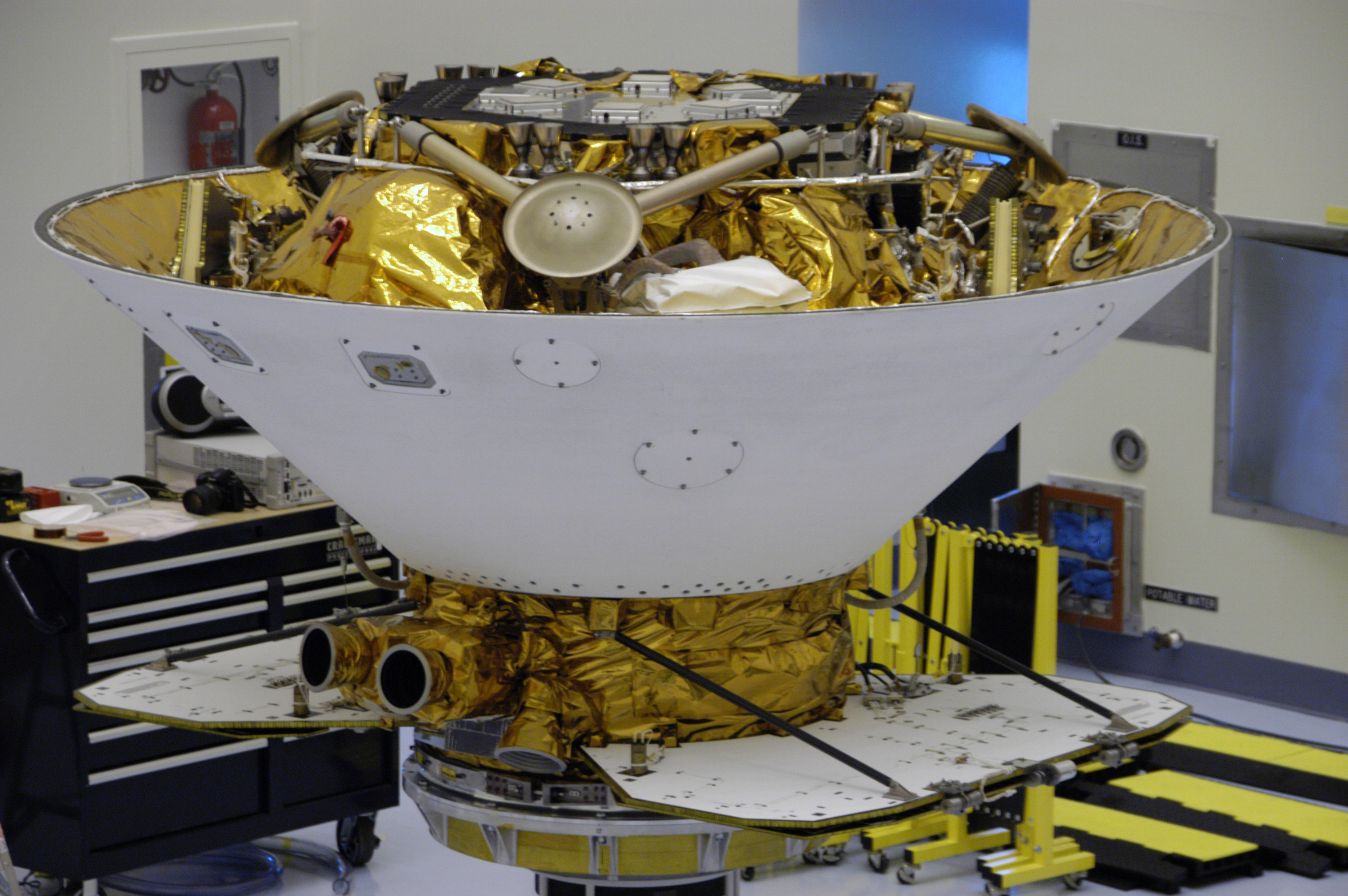 This closeup shows the Phoenix Mars Lander spacecraft nestled inside the backshell. The spacecraft is ready for spin testing on the spin table to which it is attached in the Payload Hazardous Servicing Facility. The Phoenix mission is the first project in NASA's first openly competed program of Mars Scout missions. Phoenix will land in icy soils near the north polar permanent ice cap of Mars and explore the history of the water in these soils and any associated rocks, while monitoring polar climate. Landing is planned in May 2008 on arctic ground where a mission currently in orbit, Mars Odyssey, has detected high concentrations of ice just beneath the top layer of soil. It will serve as NASA's first exploration of a potential modern habitat on Mars and open the door to a renewed search for carbon-bearing compounds, last attempted with NASA’s Viking missions in the 1970s. A stereo color camera and a weather station will study the surrounding environment while the other instruments check excavated soil samples for water, organic chemicals and conditions that could indicate whether the site was ever hospitable to life. Microscopes can reveal features as small as one one-thousandth the width of a human hair. Launch of Phoenix aboard a Delta II rocket is targeted for Aug. 3 from Cape Canaveral Air Force Station in Florida.
